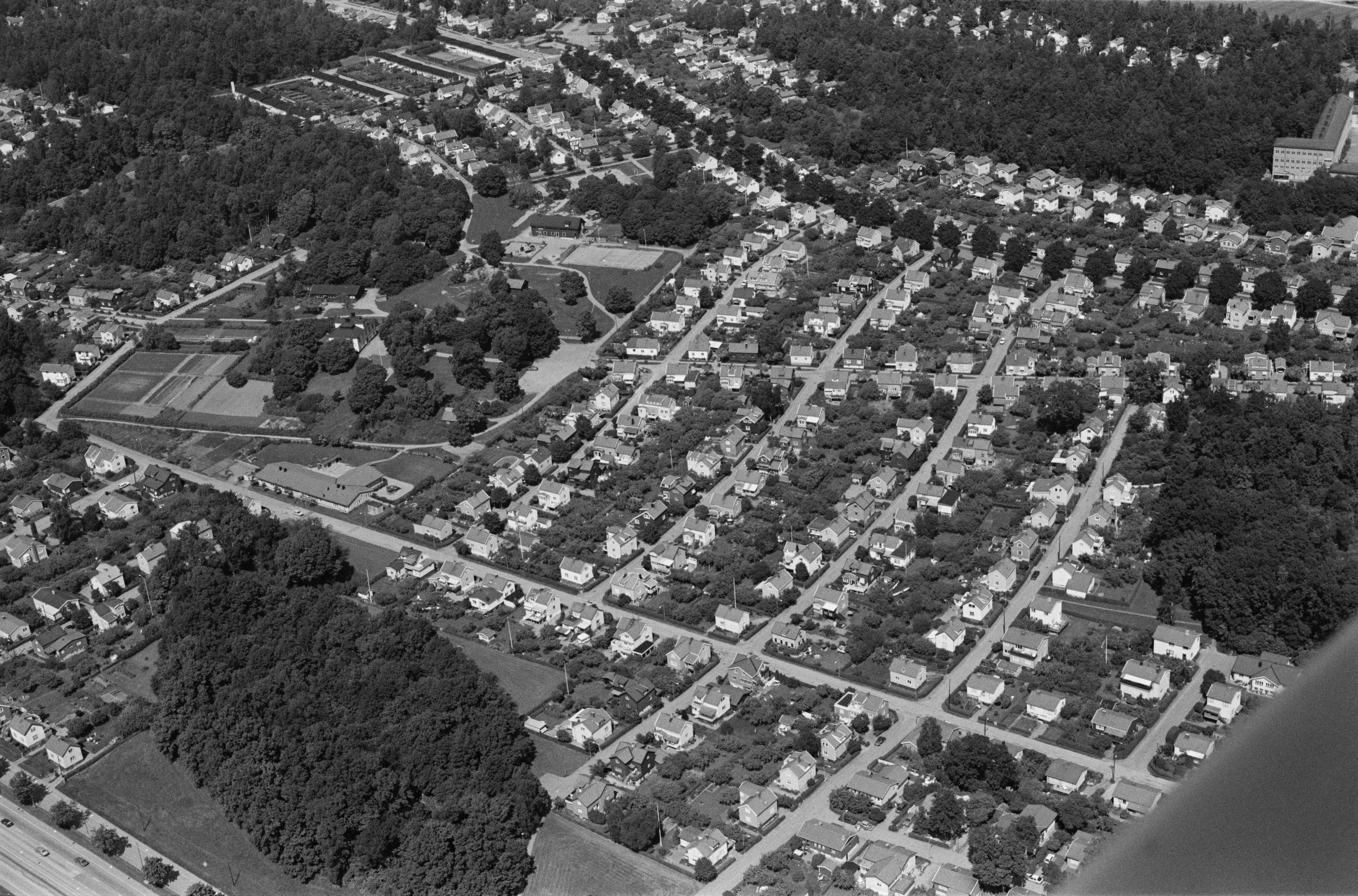 Beskrivning: Området Norra Ängby i stadsdelen Bromma i Stockholms Västerort. Till vänster om bildens mitt Stora Ängby herrgård och gravfält Björklunds hage RAÄnr Bromma 62:1. Bilden är tagen mot (väderstreck): N