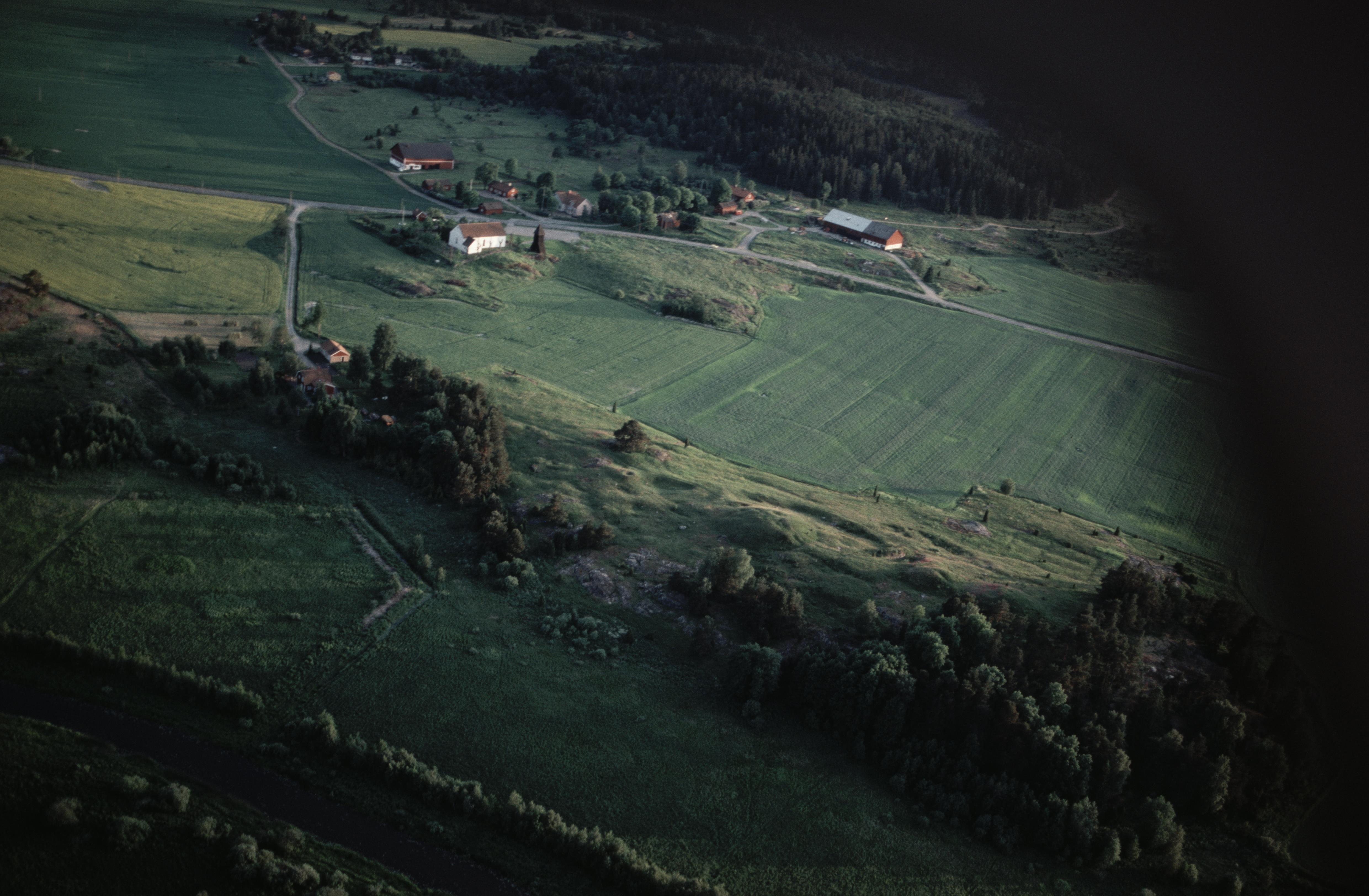 Beskrivning: Helgöåns dalgång i Långhundraleden. Ån markerar gränsen mot socknet Össeby-Garn (nere i bildens vänstra hörn). Vid bildens mitt gravfältet Sjökullarna RAÄnr Vada 10:1. I bildens övre del Vada kyrka. Bilden är tagen mot (väderstreck): SV