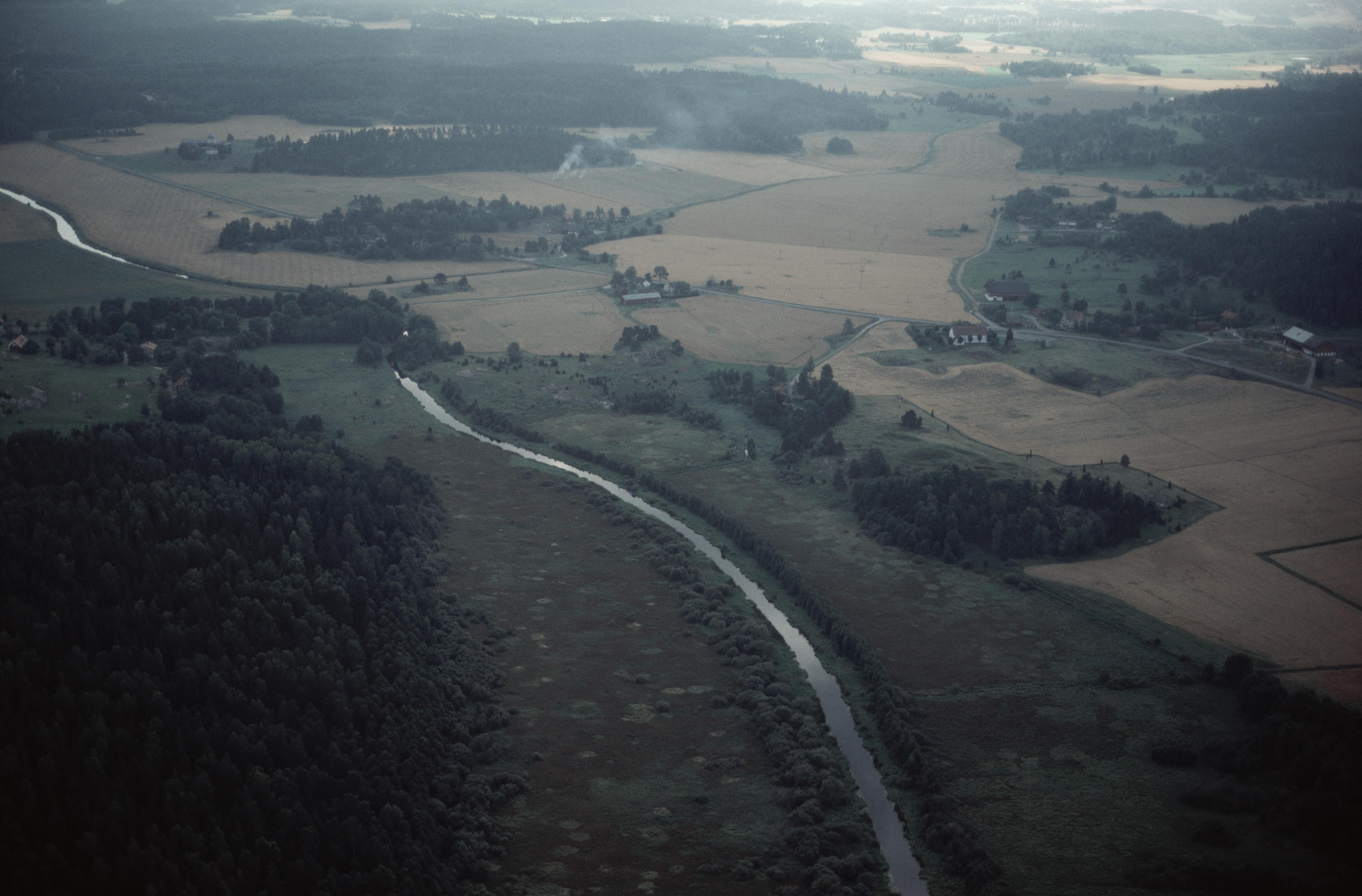 Beskrivning: Helgöåns dalgång i Långhundraleden. Ån markerar gränsen mot socknet Össeby-Garn (i bildens vänstra del). Vid bildens mitt gravfältet Sjökullarna RAÄnr Vada 10:1. I bildens övre del Vada kyrka. Bilden är tagen mot (väderstreck): SV