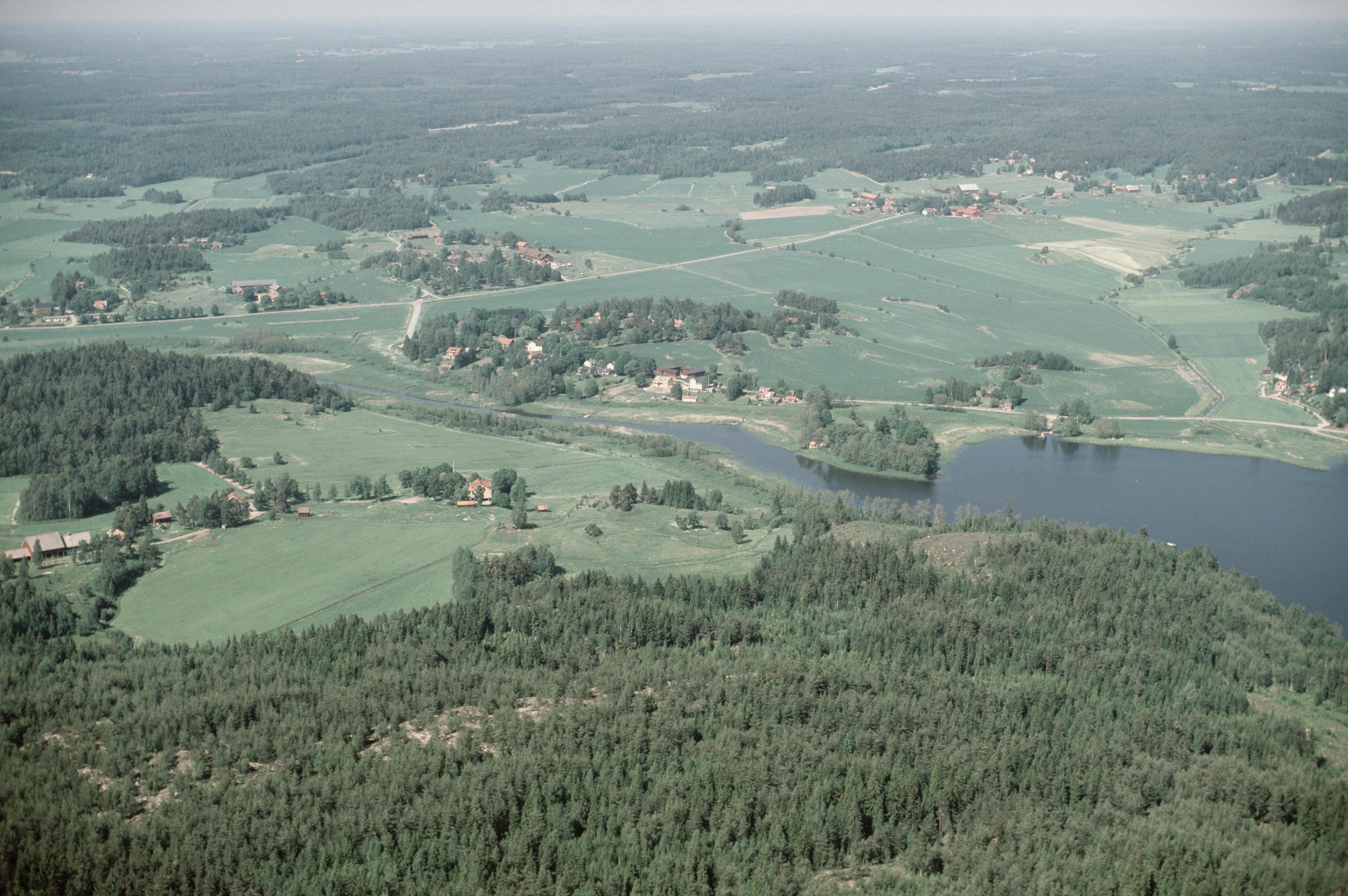 Beskrivning: Över bildens mitt Össeby-Garns kyrka och kyrkby. Vid bildens mitt Toftesta holme vid Husaåns inlopp i sjön Garnsviken. På holmen borg RAÄnr Össeby-Garn 67:1. Bilden är tagen mot (väderstreck): NNO