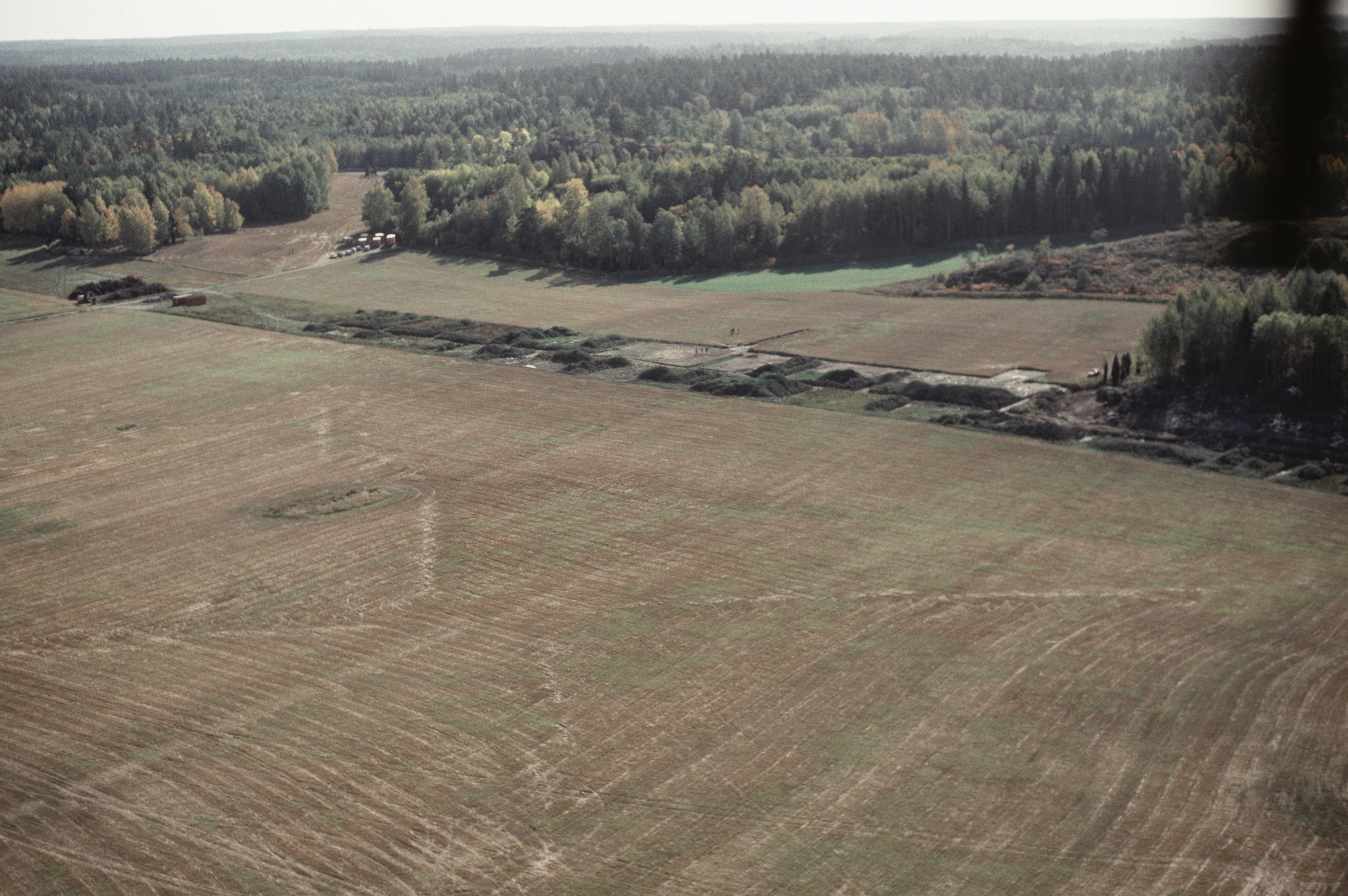Beskrivning: Arkeologisk undersökning innan järnvägen Grödingebanan byggs. Till vänster över bildens mitt boplats RAÄnr Grödinge 586:1-2 söder om Tyttinge gård. Bilden är tagen mot (väderstreck): SSO