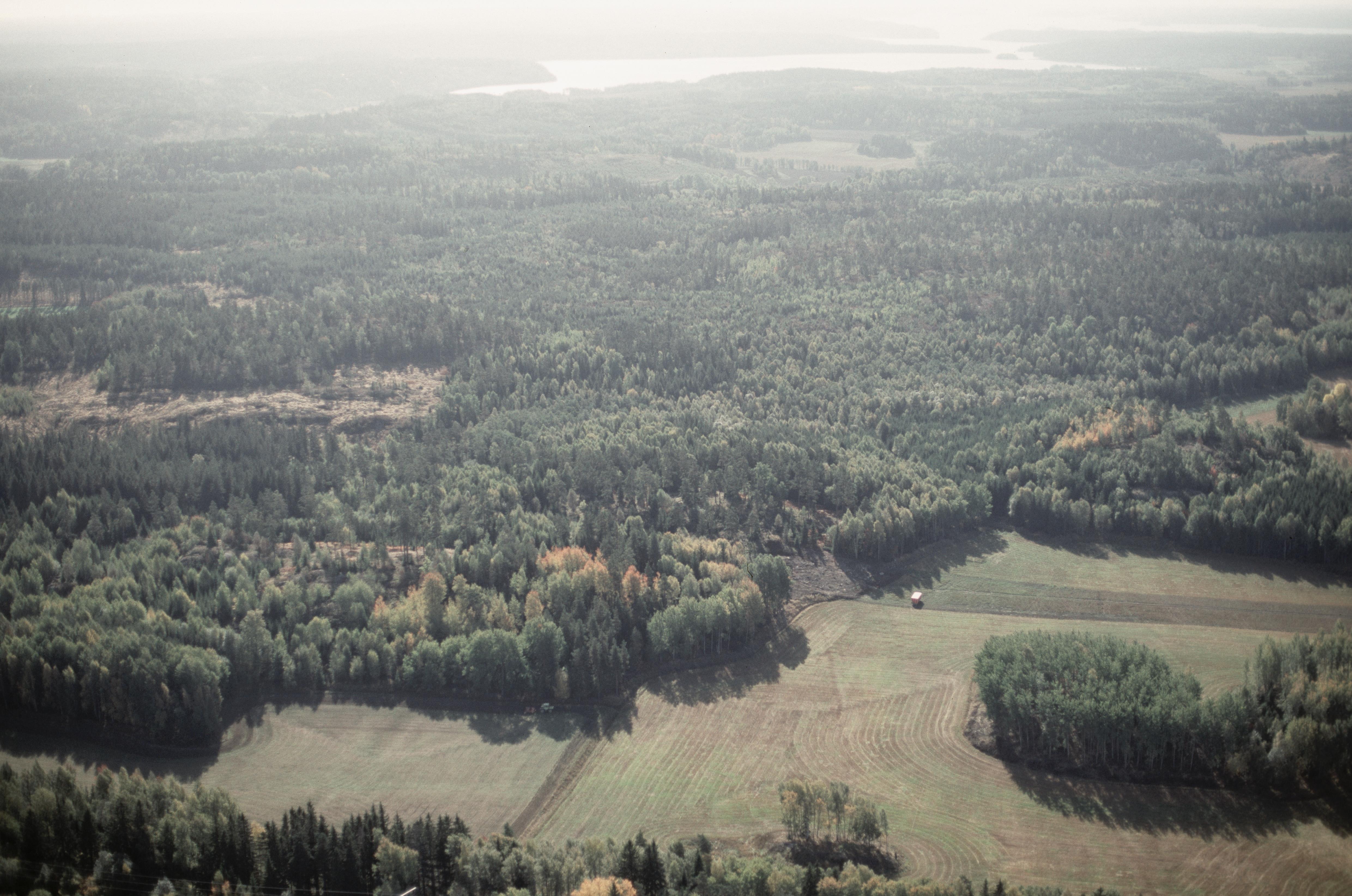 Beskrivning: Arkeologisk undersökning innan järnvägen Grödingebanan byggs. Vid bildens mitt gravfält RAÄnr Grödinge 424:1, 432:1 m.fl. söder om Tyttinge gård. Bilden är tagen mot (väderstreck): S