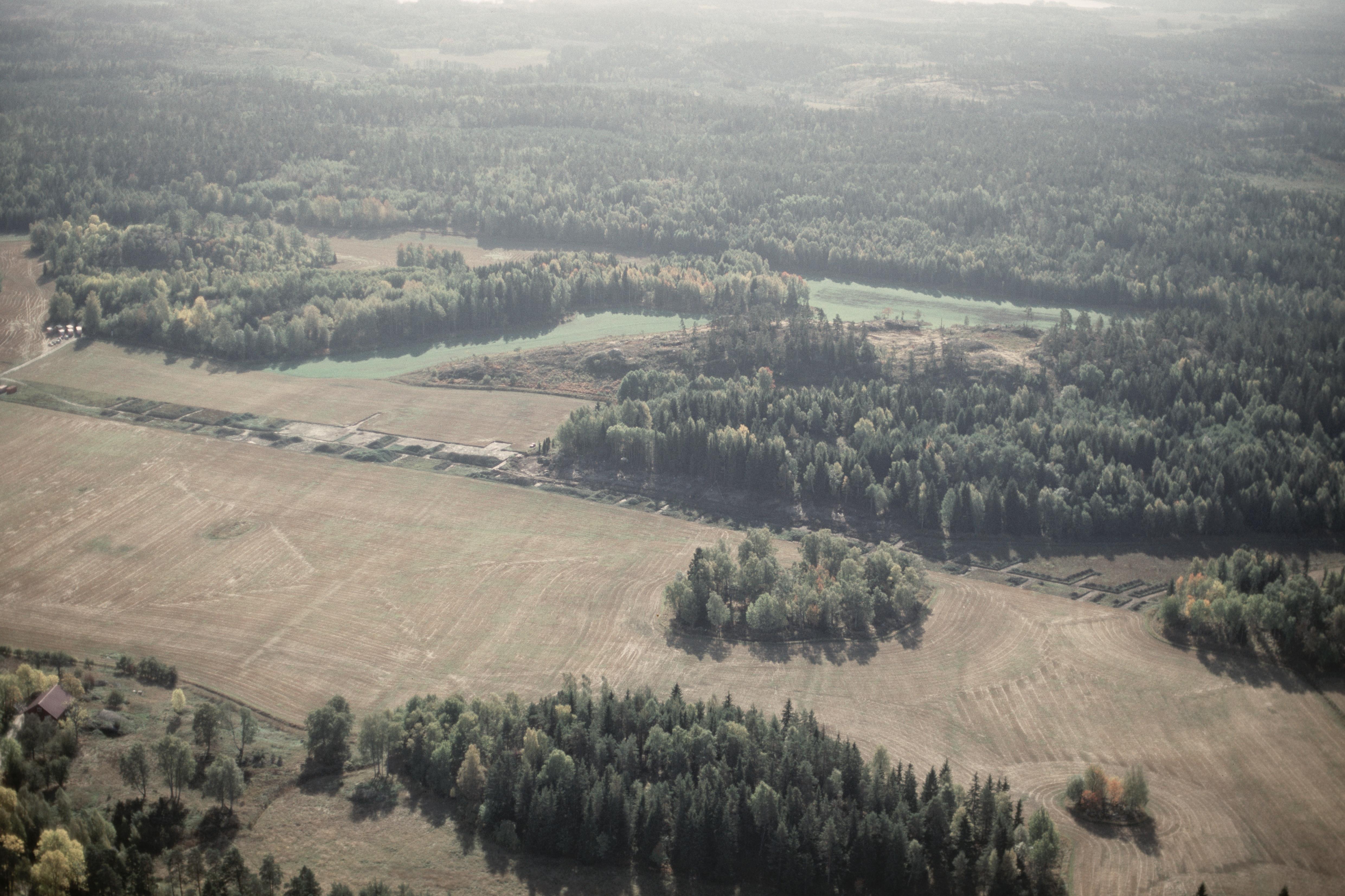Beskrivning: Arkeologisk undersökning innan järnvägen Grödingebanan byggs. Till vänster över bildens mitt boplats RAÄnr Grödinge 586:1-2 m.fl. söder om Tyttinge gård. Bilden är tagen mot (väderstreck): SSO