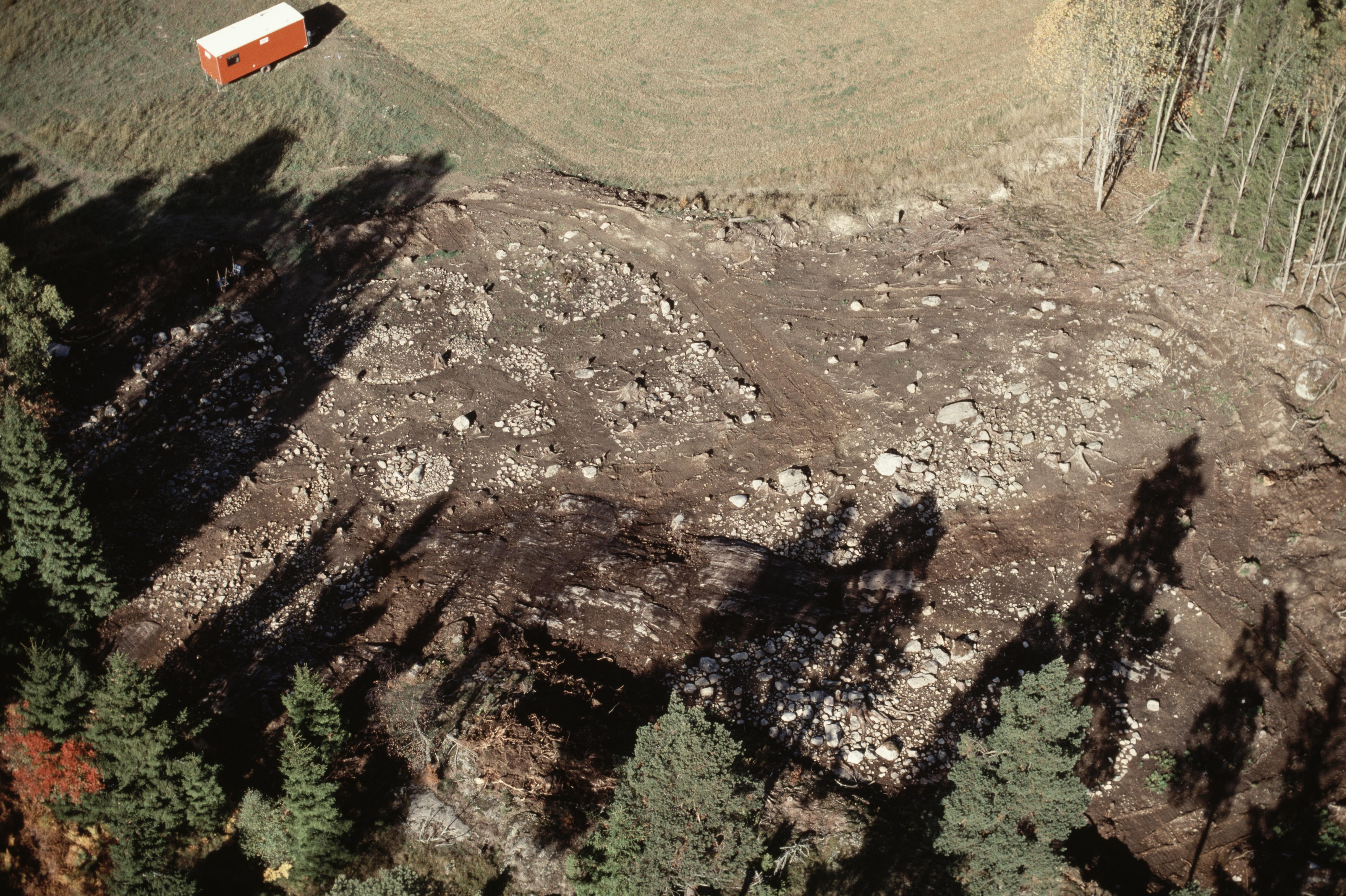 Beskrivning: Arkeologisk undersökning innan järnvägen Grödingebanan byggs, söder om Tyttinge gård. Gravfält RAÄnr Grödinge 432:1 i bildens nedre del. Bilden är tagen mot (väderstreck): NV