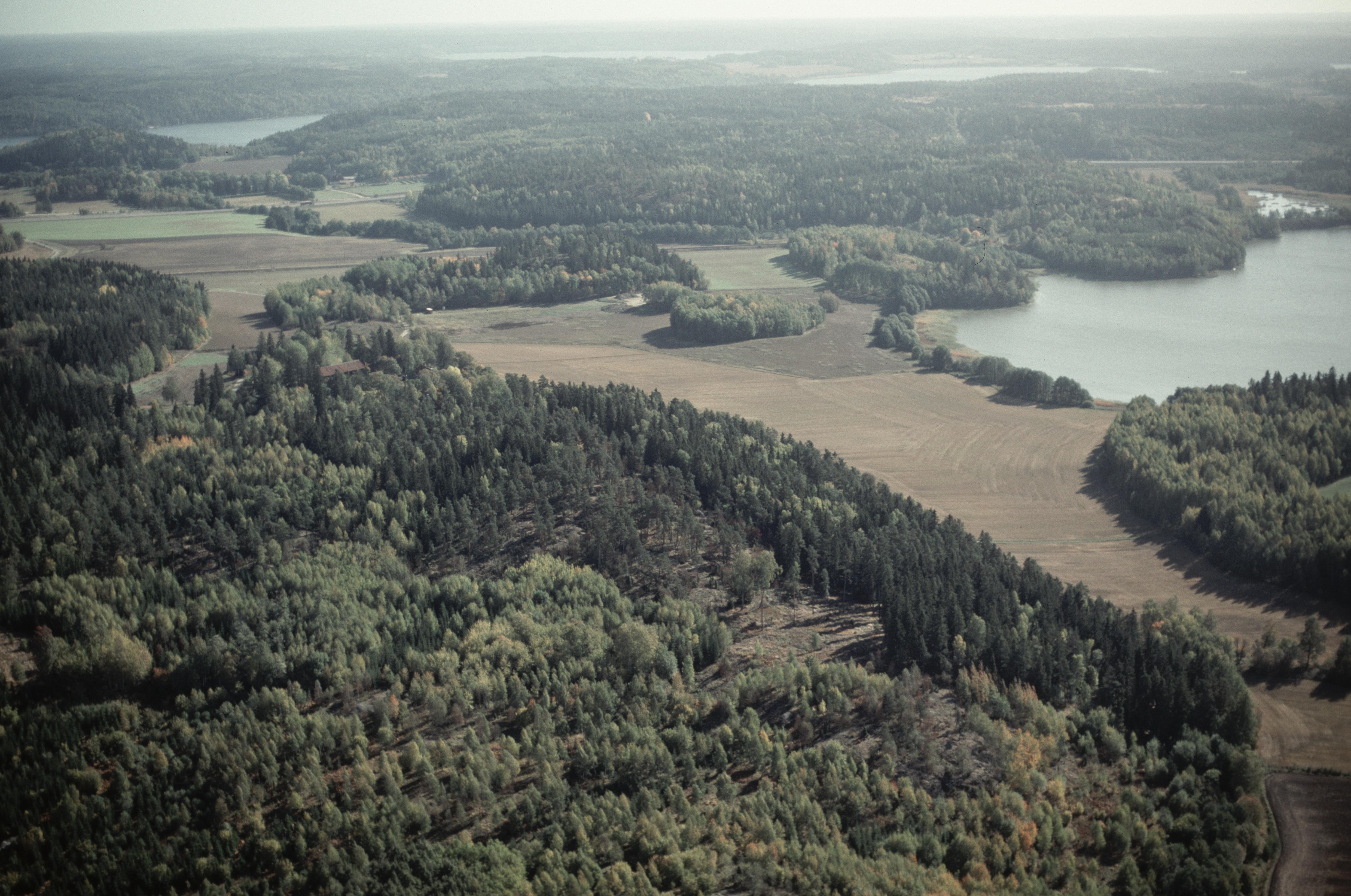 Beskrivning: Kvedesta by. Över bildens mitt arkeologisk undersökning innan järnvägen Grödingebanan byggs. Fossil åker RAÄnr Tveta 45:1-2 och fornborg Tveta 44:1 vid Rådjursbacken. Sjön Lanaren uppe till höger. Bilden är tagen mot (väderstreck): SO
