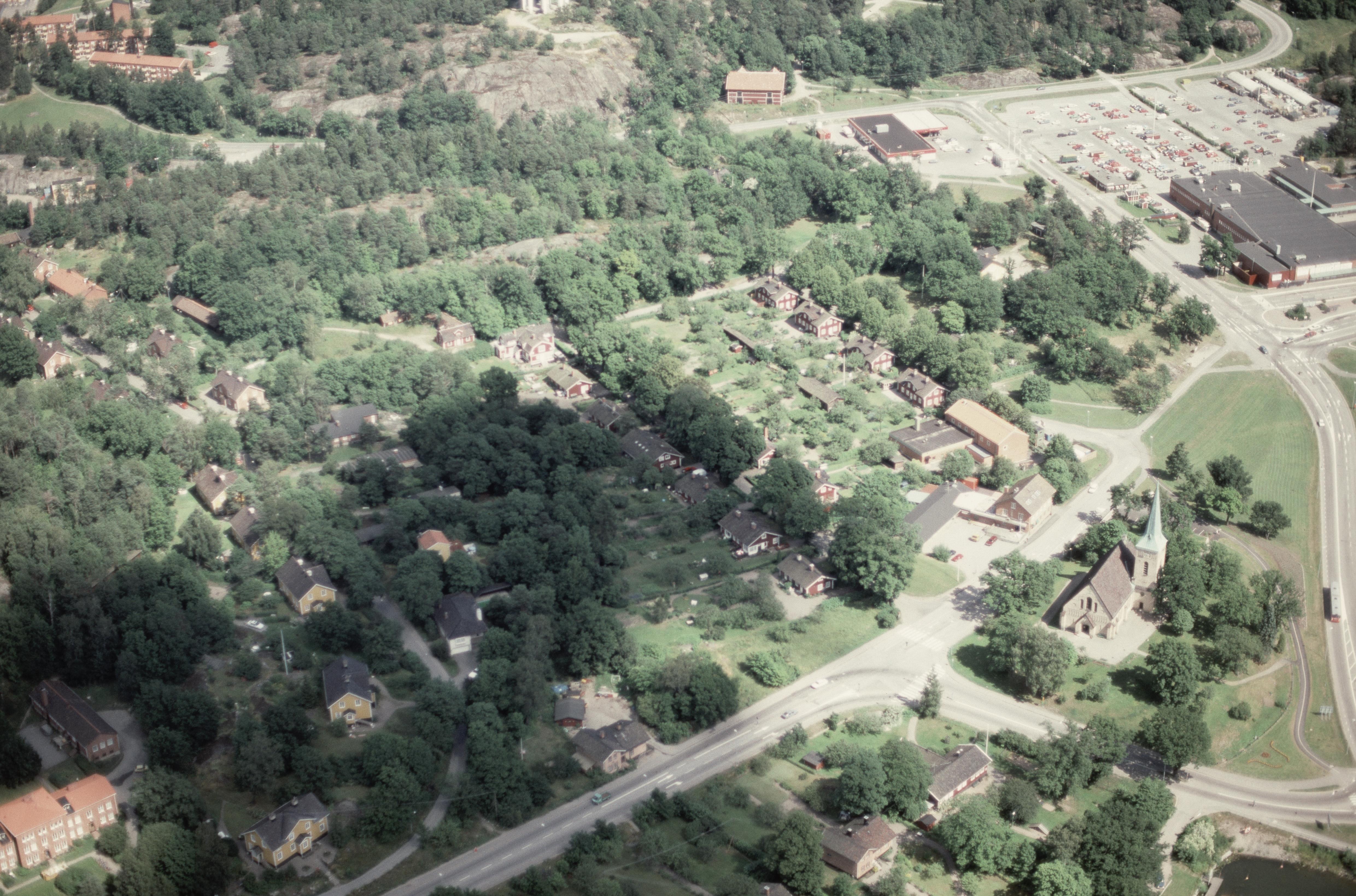 Beskrivning: Gustavsbergs tätort. Gustavsbergs kyrka. Över bildens mitt arbetarbostäder för porslinsfabriken, Grindstugatan RAÄnr Gustavsberg 36:1. Till vänster i gatans övre ände byggnaden det Gamla Apoteket. Värmdögatan i bildens högra del. Bilden är tagen mot (väderstreck): ONO
