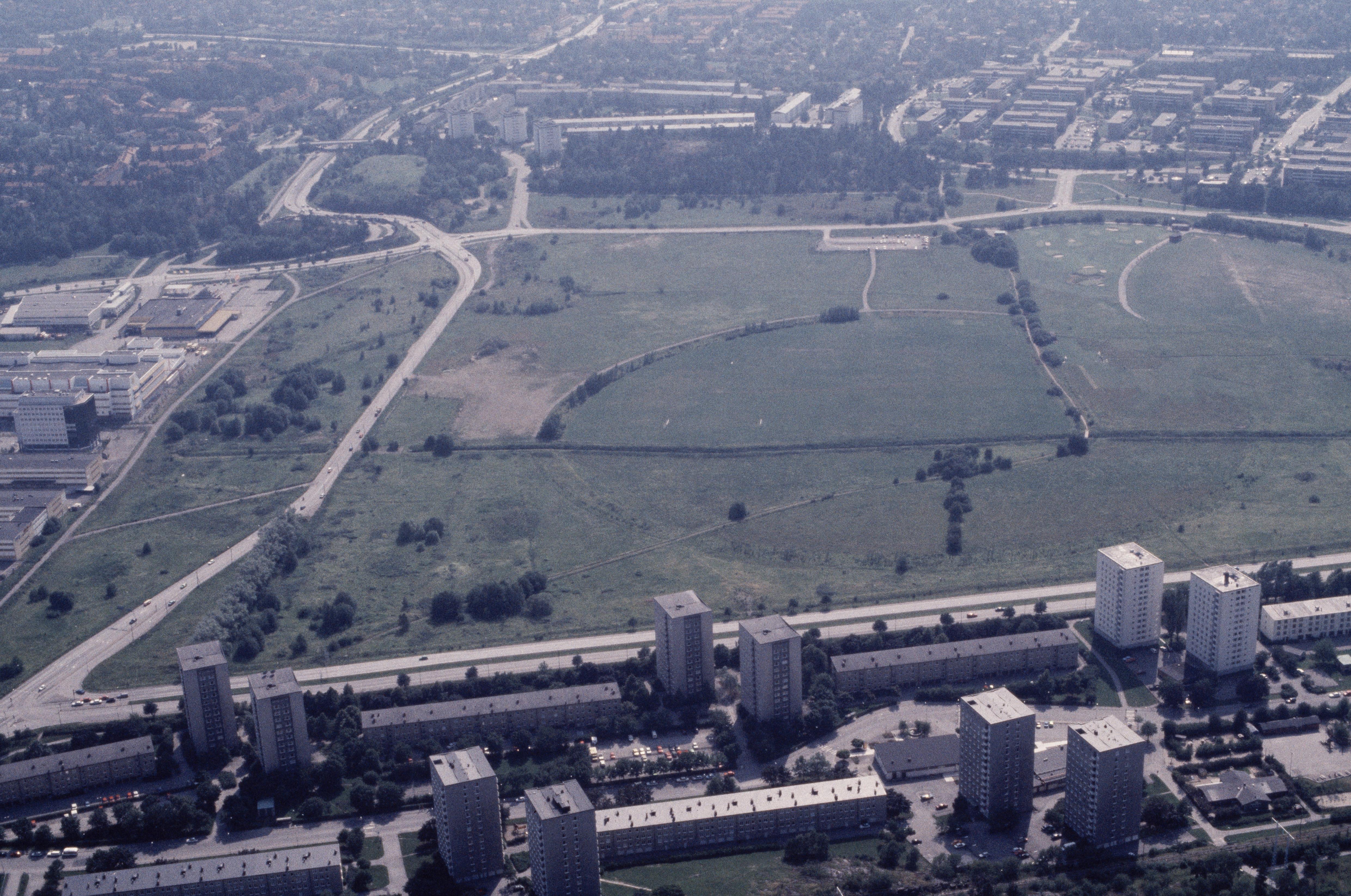 Beskrivning: Årsta. Vid bildens mitt Årstafältet med golfbana och Göta landsväg RAÄnr Brännkyrka 34:1. (NB! Tidigare var området i Brännkyrka socken). Bilden är tagen mot (väderstreck): SV
