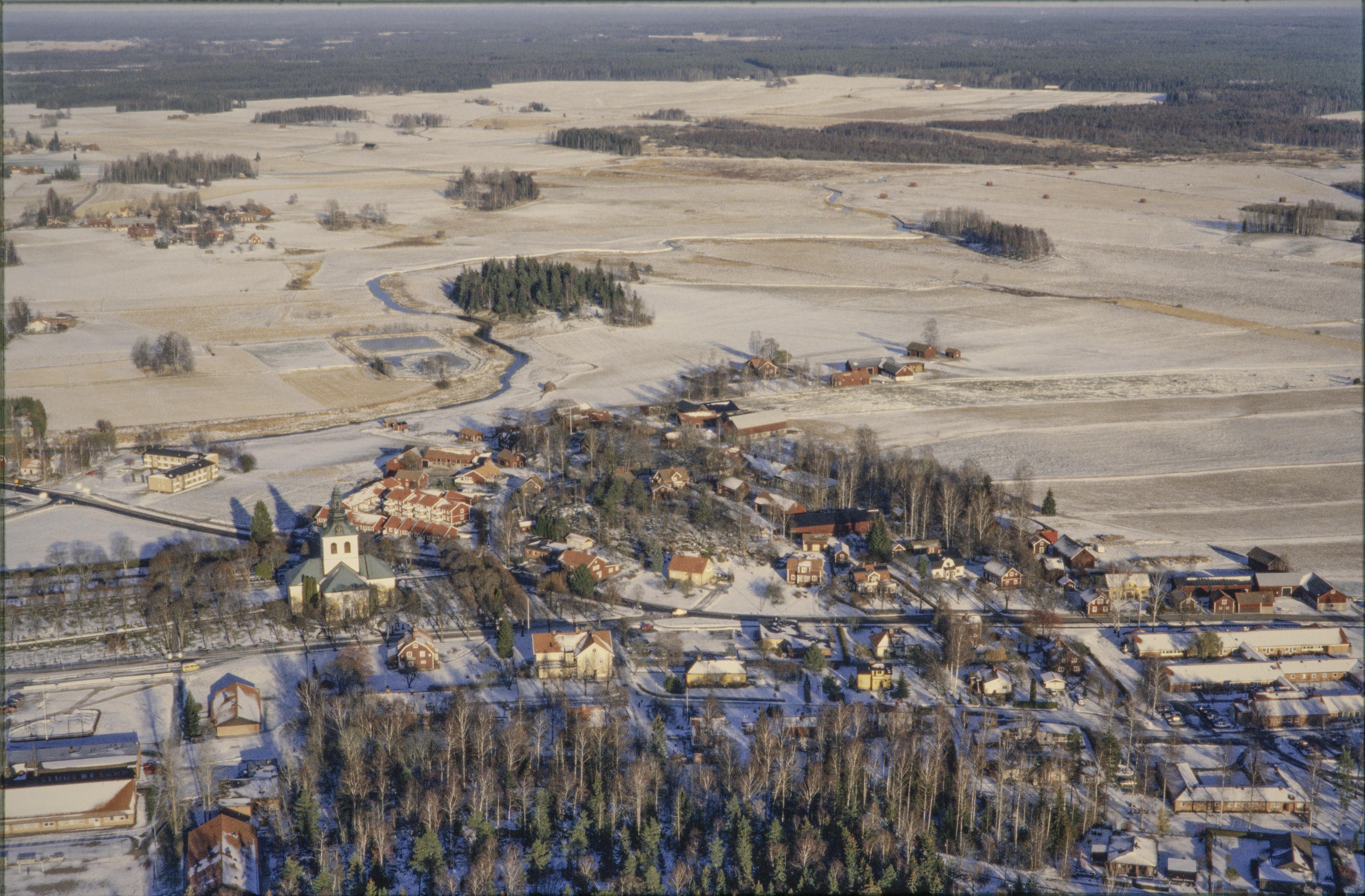 Beskrivning: Västerfärnebo kyrka och kyrkby i Svartåns dalgång. Vid kyrkan fyndplats (bl.a. flintgods) RAÄnr Västerfärnebo 588. Bilden är tagen mot (väderstreck): NNO