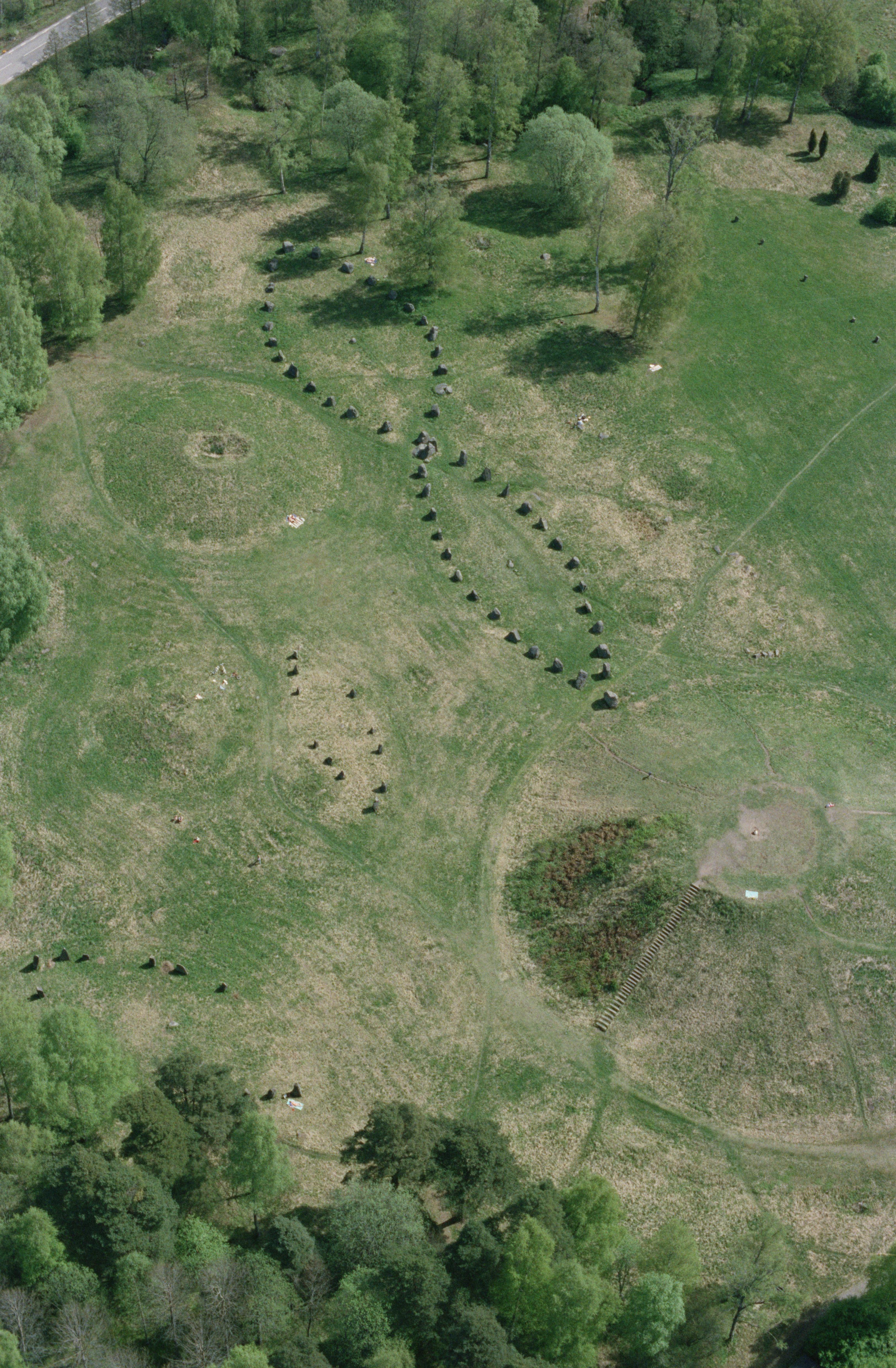 Beskrivning: Fornlämningsområdet Anundshög RAÄnr Västerås 431:1 vid Badelundaåsen i Badelunda. I området finns storhög, skeppssättningar, väglämningar och runsten m.m. Bilden är tagen mot (väderstreck): Ö