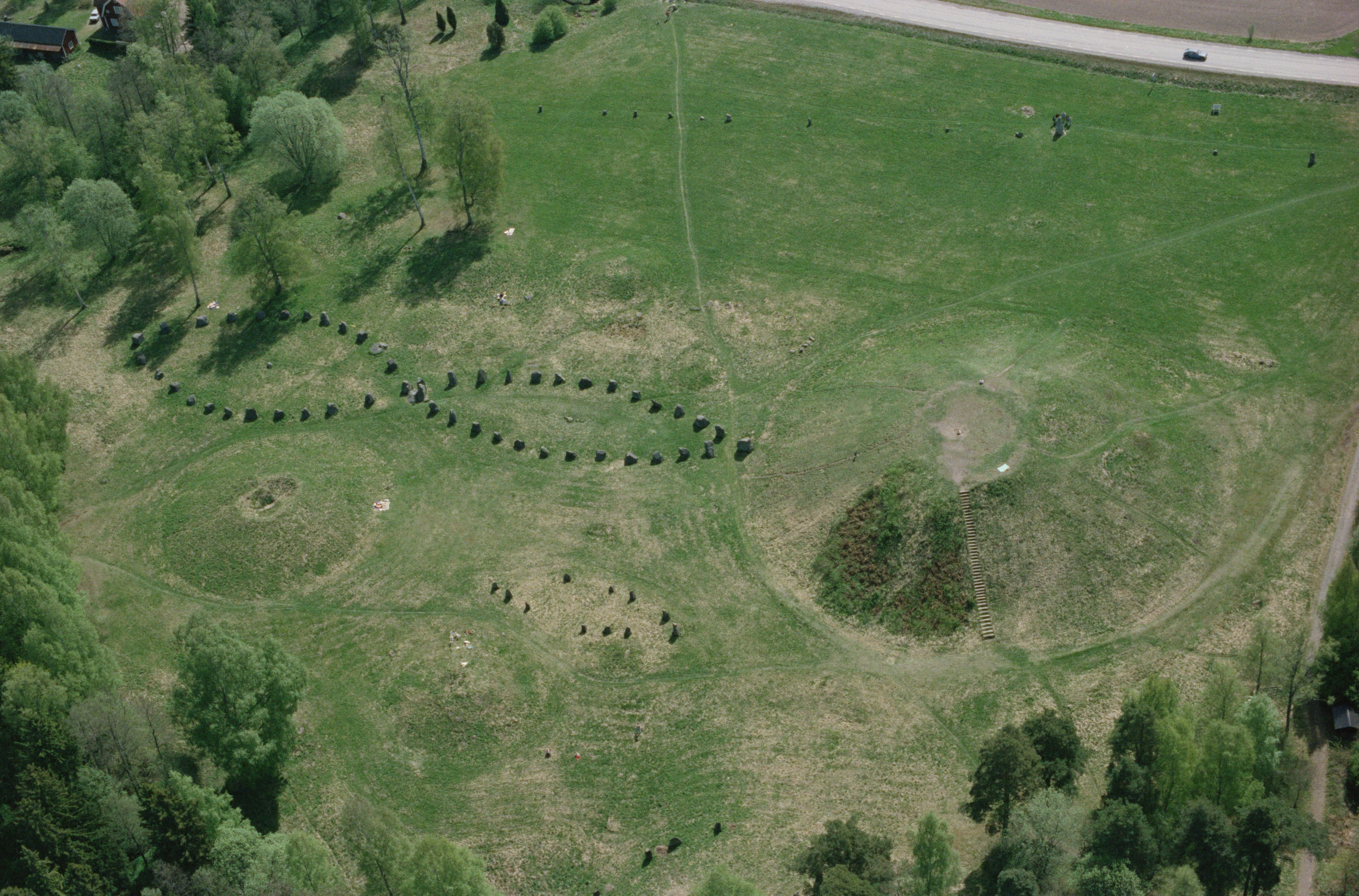 Beskrivning: Fornlämningsområdet Anundshög RAÄnr Västerås 431:1 vid Badelundaåsen i Badelunda. I området finns storhög, skeppssättningar, väglämningar och runsten m.m. Bilden är tagen mot (väderstreck): SSO