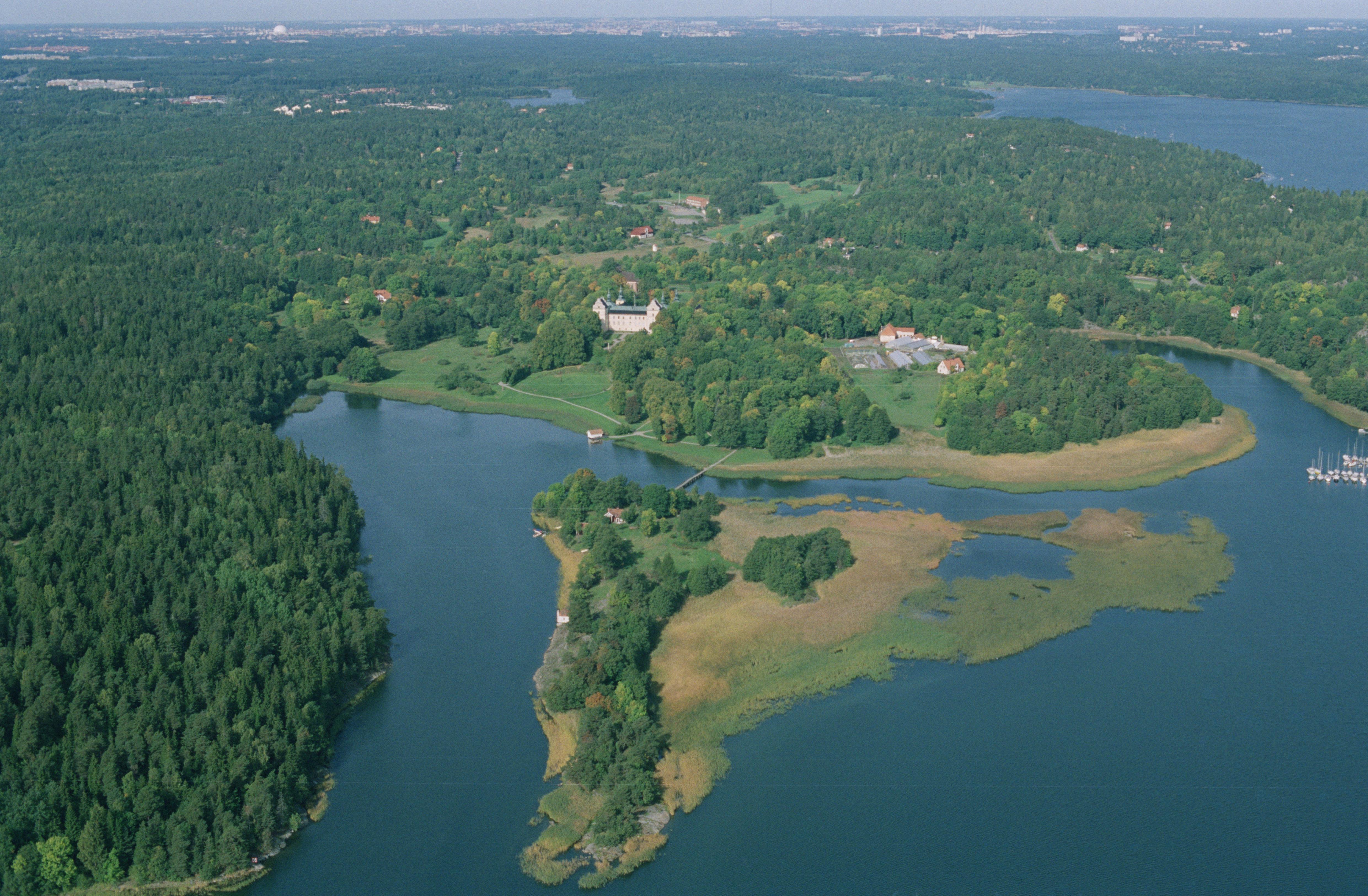 Beskrivning: Tyresö kyrka och Tyresö slott (byggnadsminne RAÄnr Tyresö 37:1) vid Kalvfjärden. Erstaviken uppe till höger. Bilden är tagen mot (väderstreck): NV