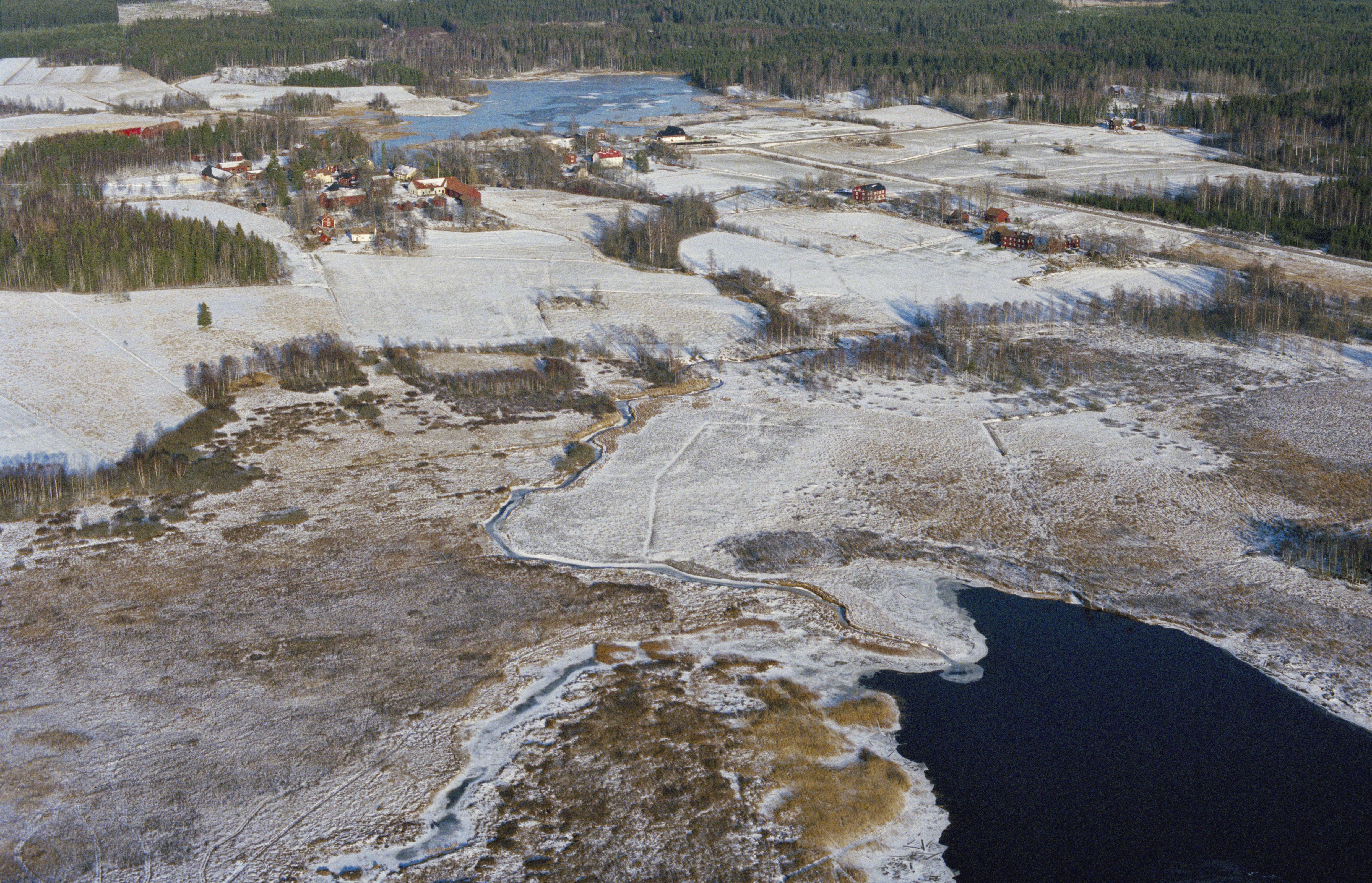 Beskrivning: Olsbennings by mellan sjöarna Dammen (i bildens övre del) och Bågen (i bildens nedre del) i Svartåns dalgång. Hytt- och hammarområde RAÄnr Karbenning 27:1 vid bildens mitt, i bildens övre del hyttområde Karbenning 26:1-2. Bilden är tagen mot (väderstreck): NO