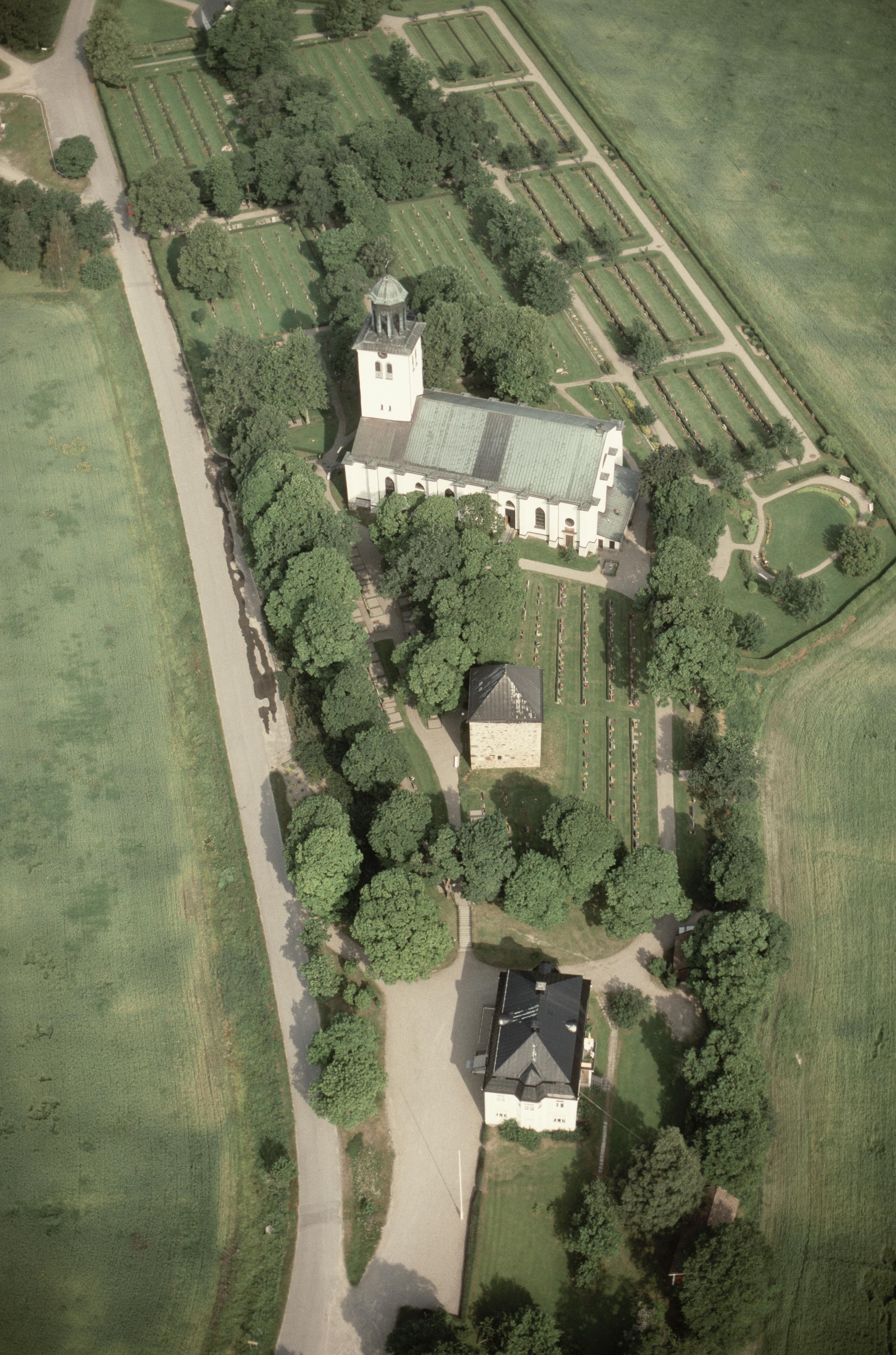Beskrivning: Fellingsbro kyrka och kyrkby i Ässingåns dalgång. Vid bildens mitt kastalruinen RAÄnr Fellingsbro 231:1. Bilden är tagen mot (väderstreck): NV