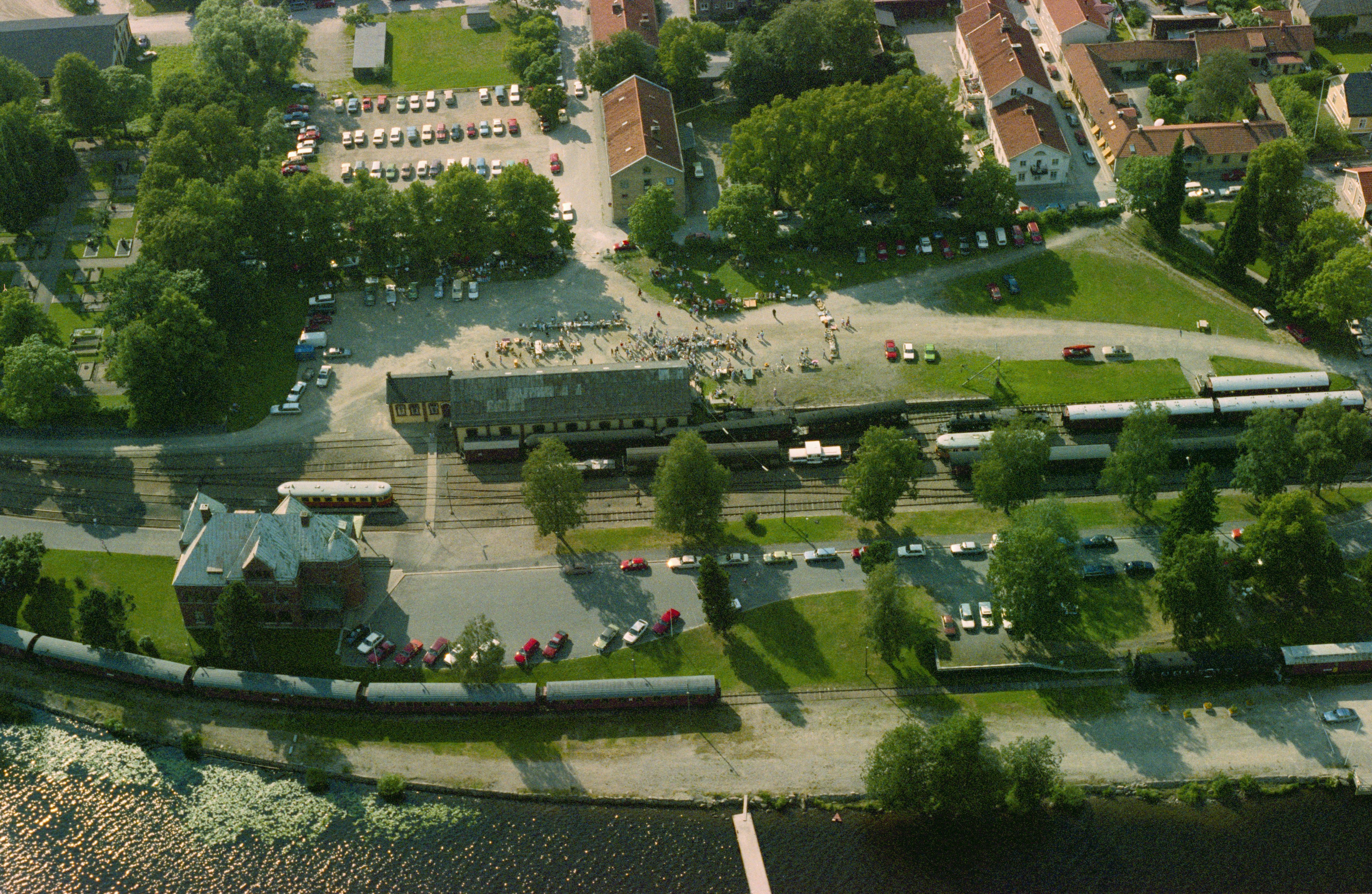 Beskrivning: Nora stad vid Hagbyån och Norasjön. Nora järnvägsstation i stadslager RAÄnr Nora 164:1 i området vid kyrkan och Torget. Bilden är tagen mot (väderstreck): V