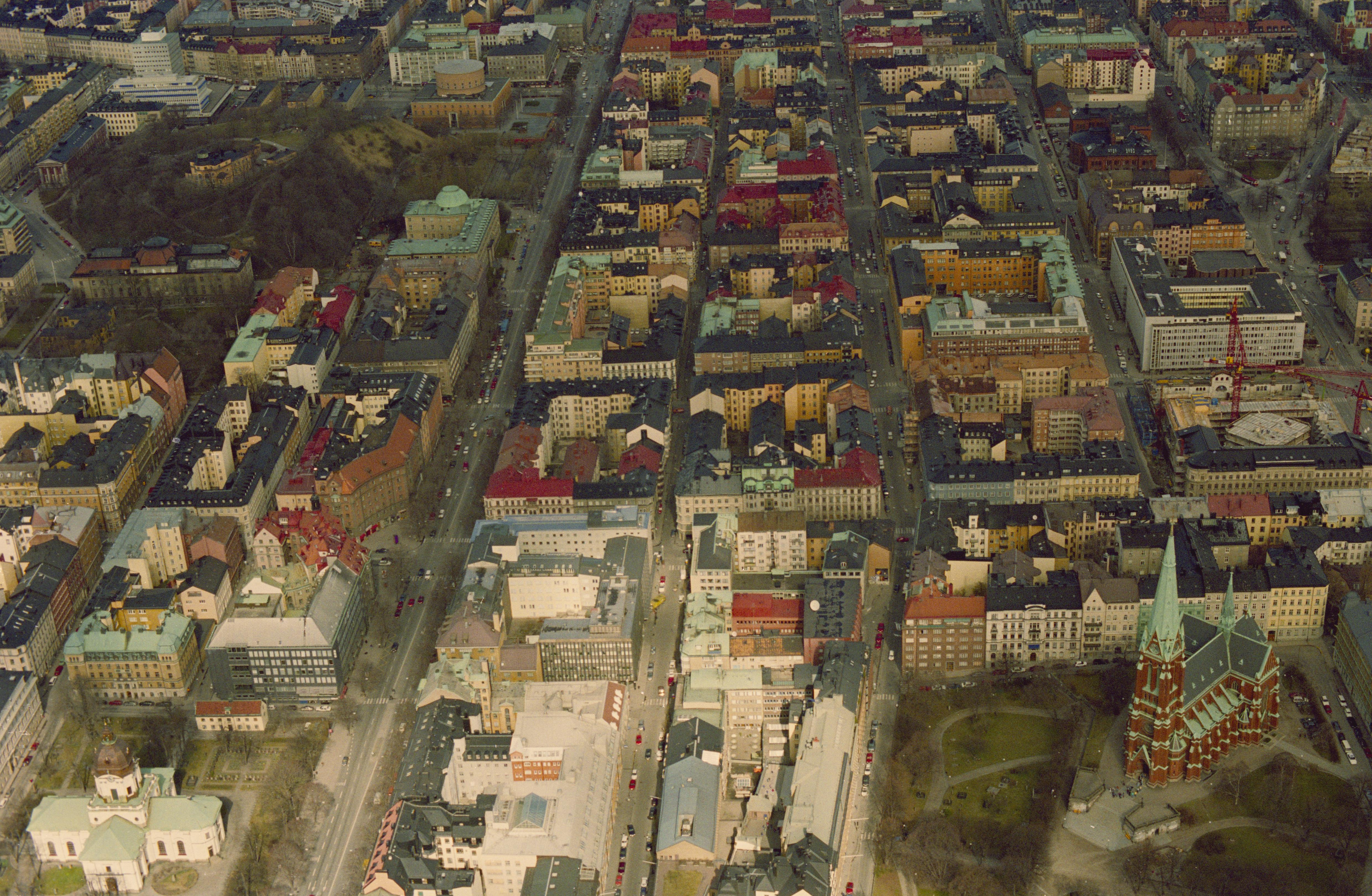 Beskrivning: Norrmalm. Gatorna Saltmätargatan, Sveavägen, Luntmakargatan, Döbelnsgatan, Tulegatan, Kungstensgatan, Rådmansgatan, Tegnérgatan m.fl. vid Kvarteret Jägaren m.m. Uppe till vänster Stockholms stadsbibliotek och Handelshögskolan. Johanneskyrkan nere till höger. Bilden är tagen mot (väderstreck): NNV