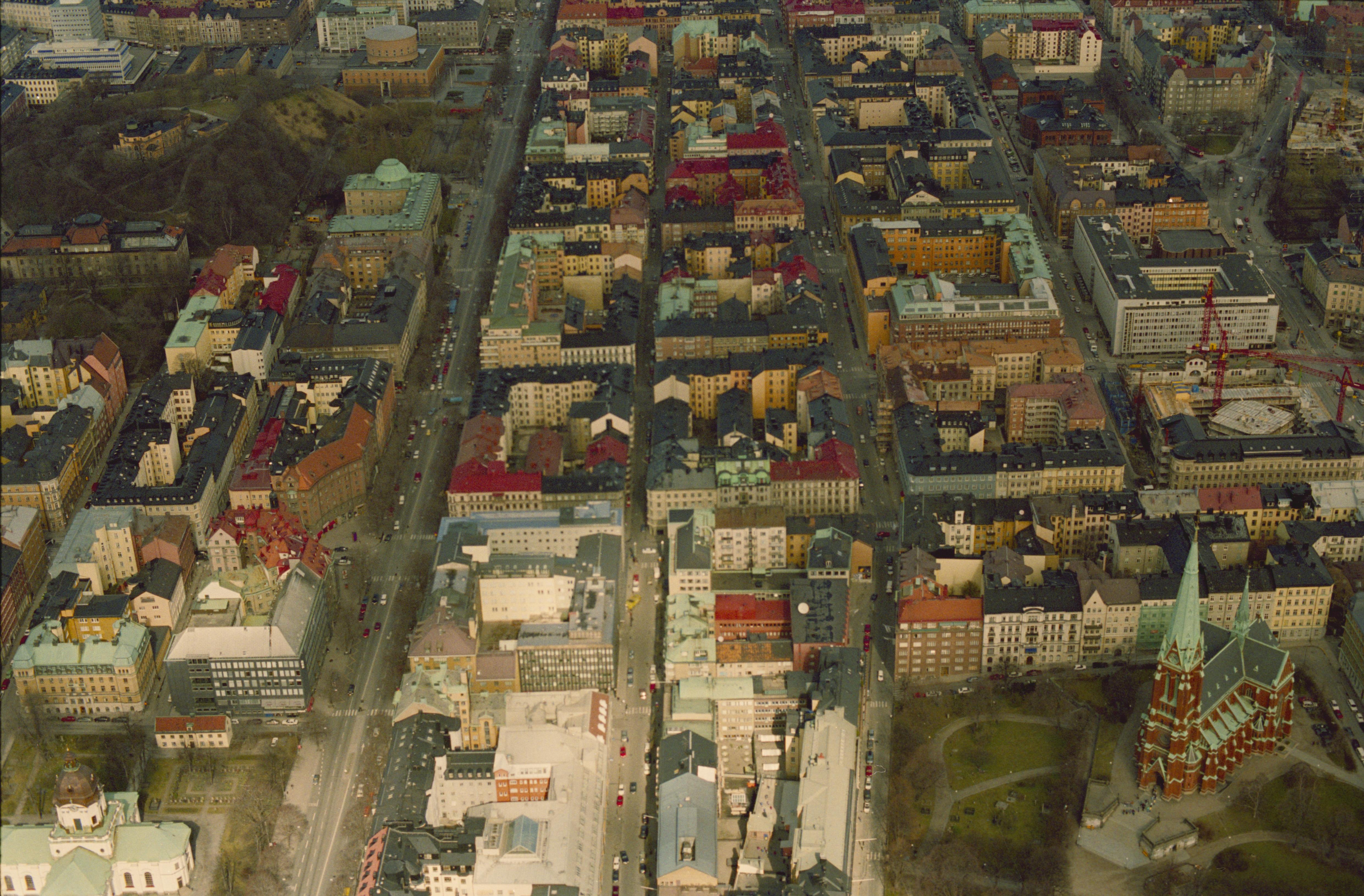 Beskrivning: Norrmalm. Gatorna Saltmätargatan, Sveavägen, Luntmakargatan, Döbelnsgatan, Tulegatan, Kungstensgatan, Rådmansgatan, Tegnérgatan m.fl. vid Kvarteret Jägaren m.m. Uppe till vänster Stockholms stadsbibliotek och Handelshögskolan. Johanneskyrkan nere till höger. Bilden är tagen mot (väderstreck): NNV