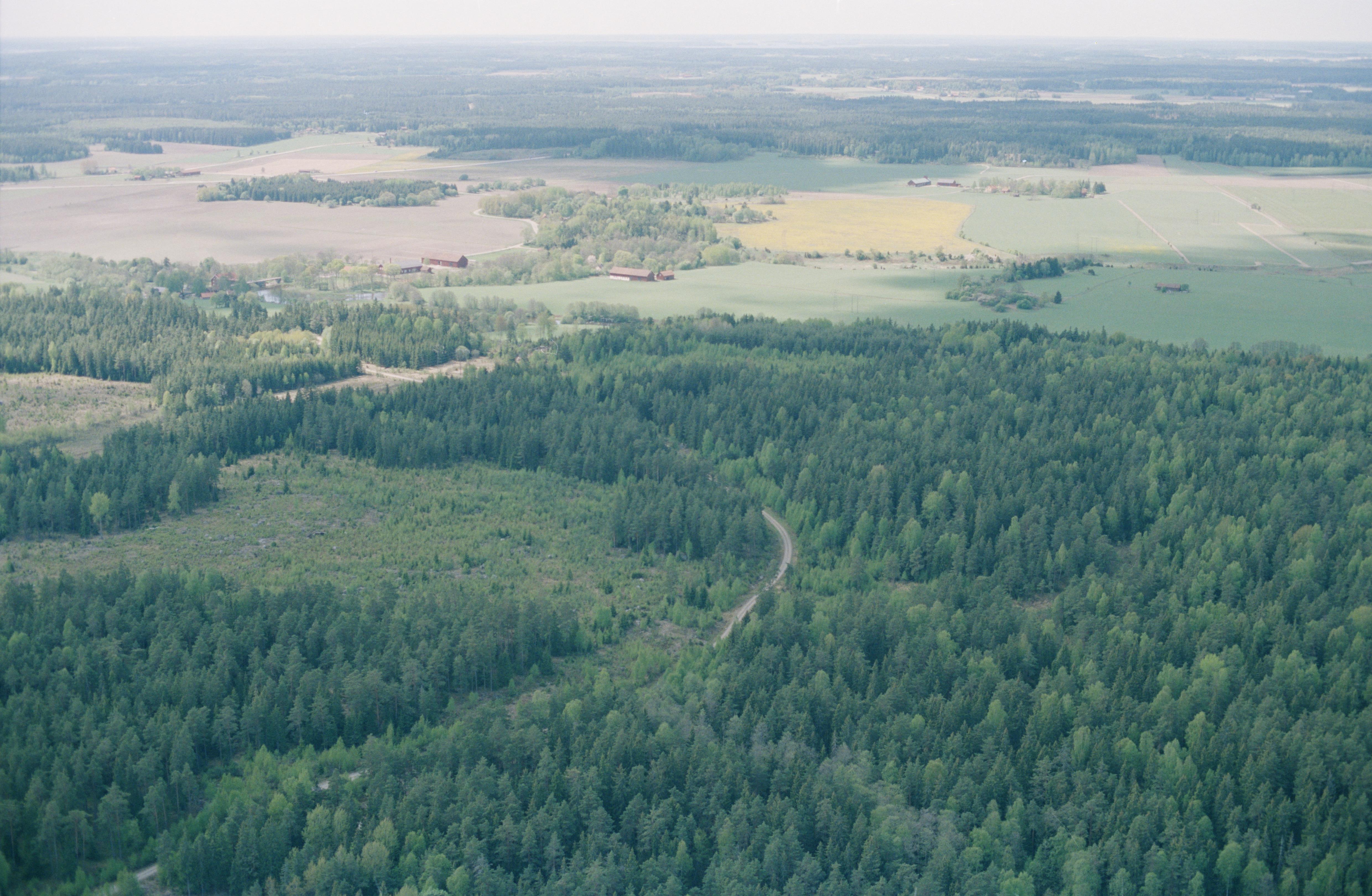 Beskrivning: Över bildens mitt Nykvarn och Östanbro där Lillån och Sagån möts. Sagån markerar gränsen mellan Tillinge socken i landskapet Uppland i riksintresset C55 (i bildens nedre del) och Björksta socken i landskapet Västmanland i riksintresset U28 (i bildens övre del). Till vänster över bildens mitt Ekensbergs by och Blotsvens hög RAÄnr Tillinge 33:1-3. Bilden är tagen mot (väderstreck): SV