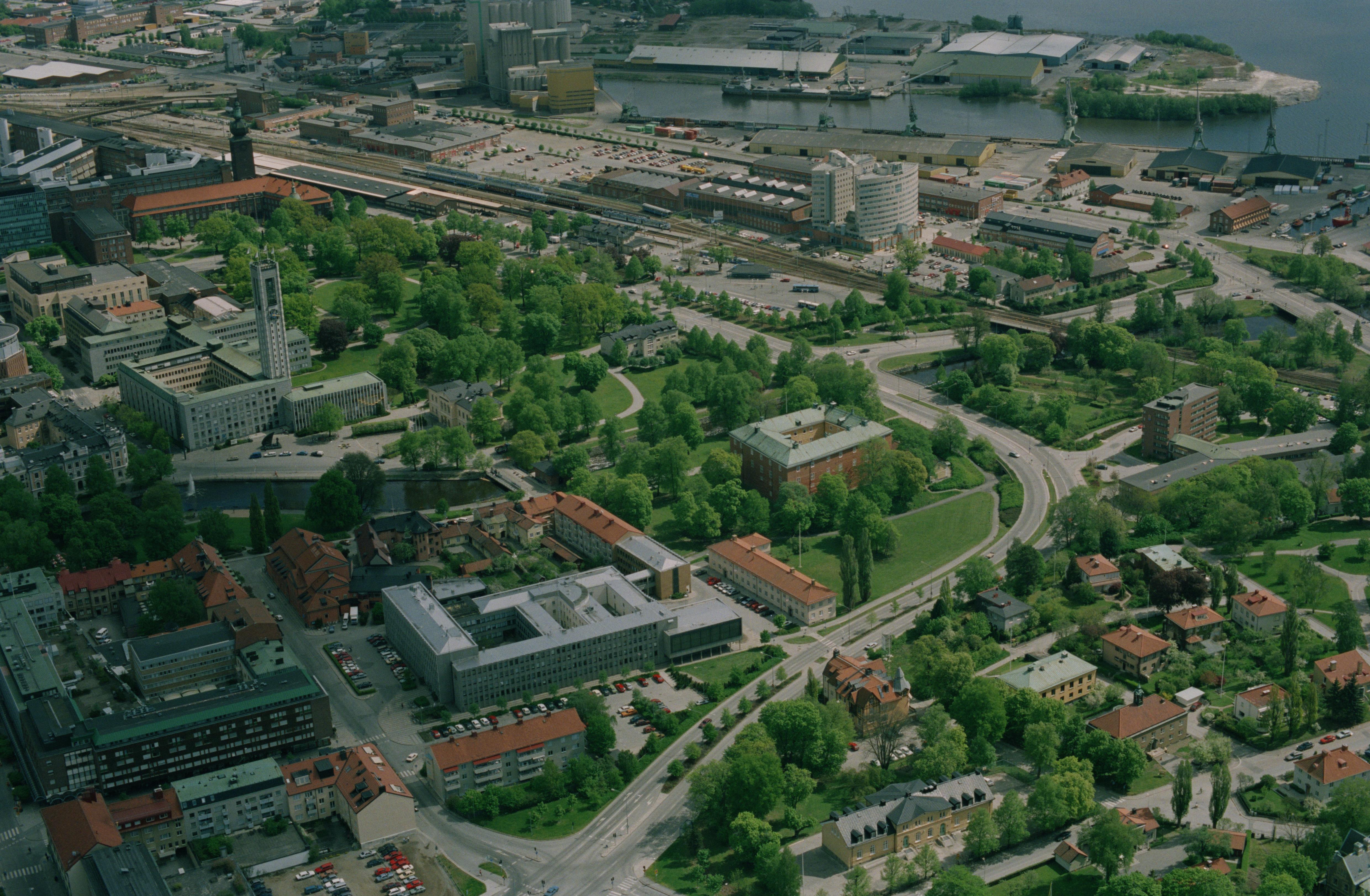 Beskrivning: Västerås stad vid Svartån och Västeråsfjärden i Mälaren. Stadslager RAÄnr Västerås 232:1. Till vänster om bildens mitt Västerås rådhus, och vid mitten statliga byggnadsminnet RAÄnr Västerås 224:1 Västerås slott. Hamnområde i bildens övre del. Bilden är tagen mot (väderstreck): OSO
