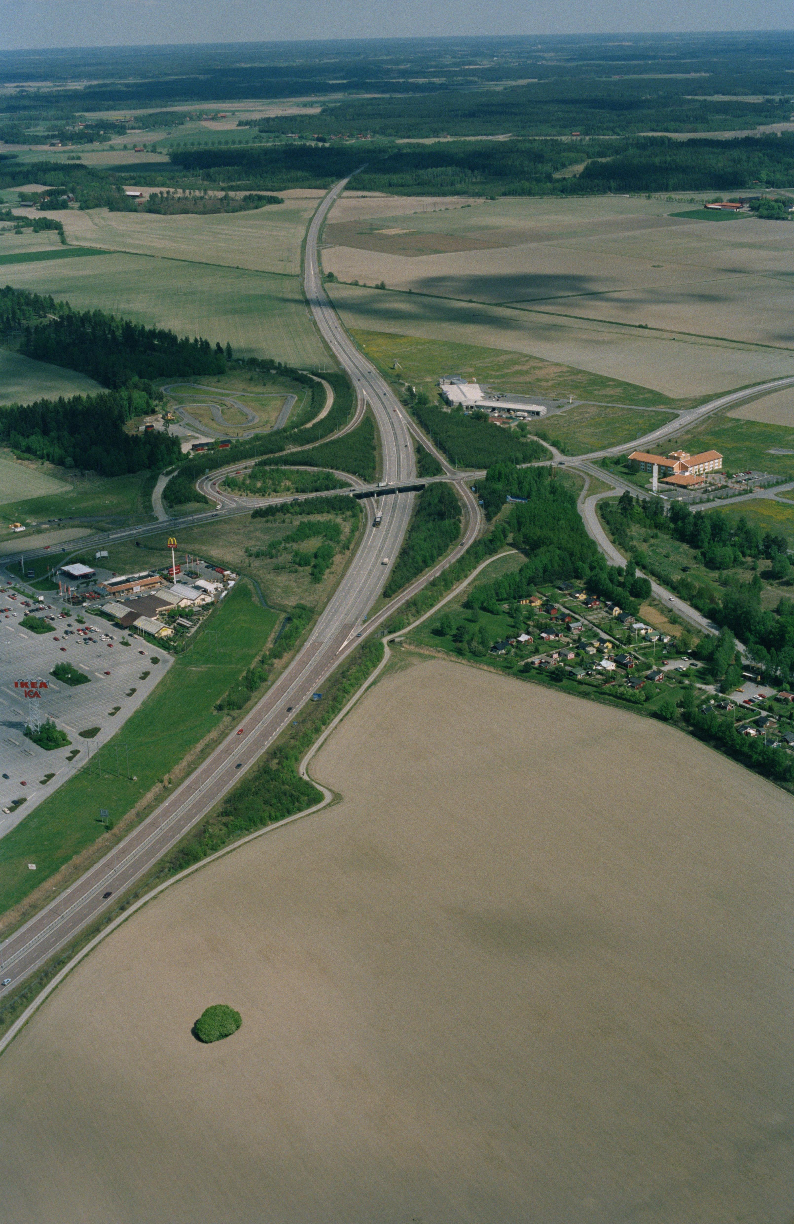 Beskrivning: Trafikplats Hällamotet i stadsdelen Hälla i östra delen av Västerås stad. I vägkorsningen vid bildens mitt gravfält RAÄnr Västerås 450:1. Bilden är tagen mot (väderstreck): NO