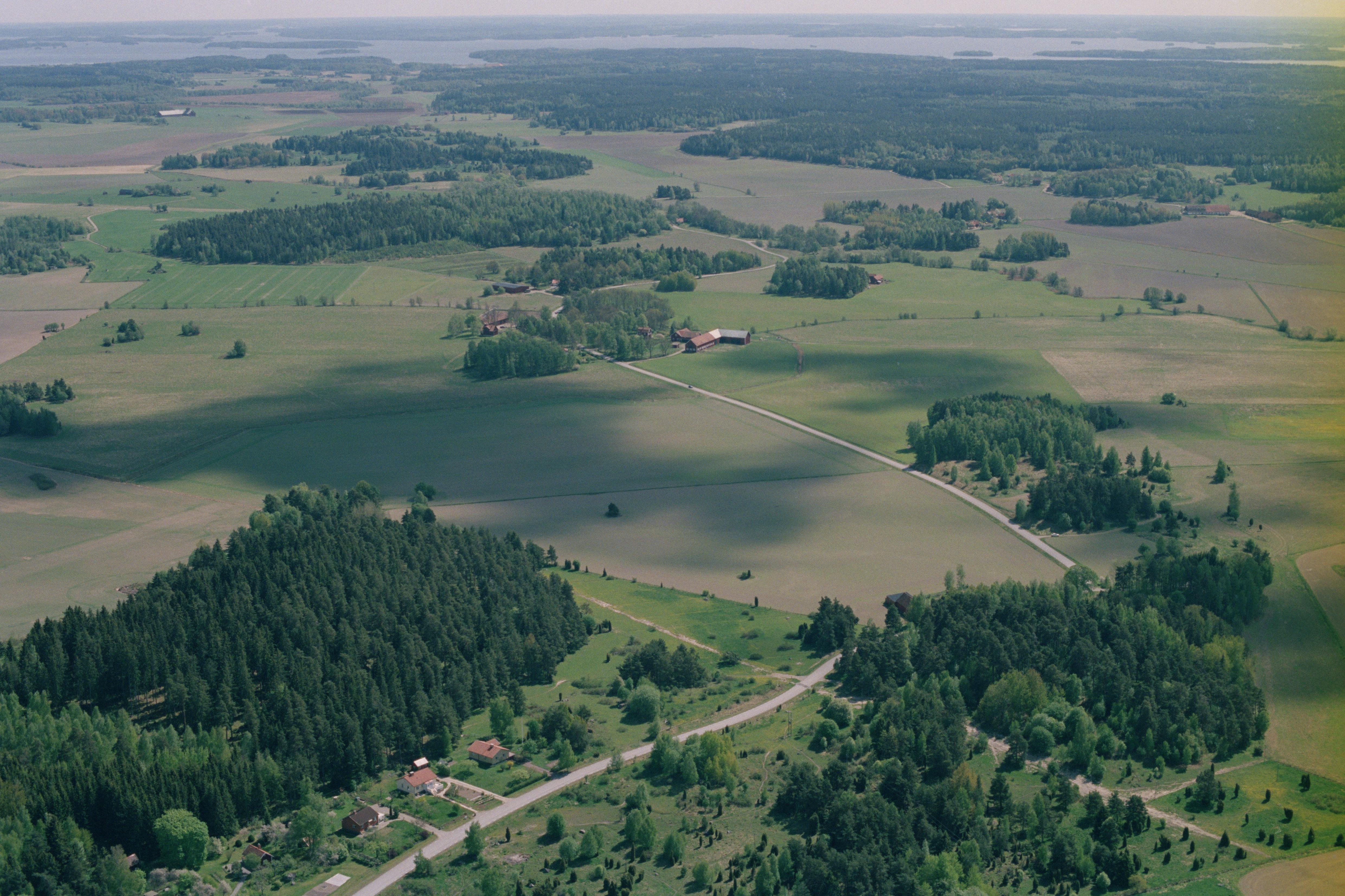 Beskrivning: I bildens nedre del Kisslingebacke med fornlämningar RAÄnr Irsta 31:1, 339:1, 351:1, m.fl. Älby vid bildens mitt. I bildens övre kant Gäddeholm herrgård och Limsta kvarn mot Hässlösundet i Mälaren. Bilden är tagen mot (väderstreck): SV