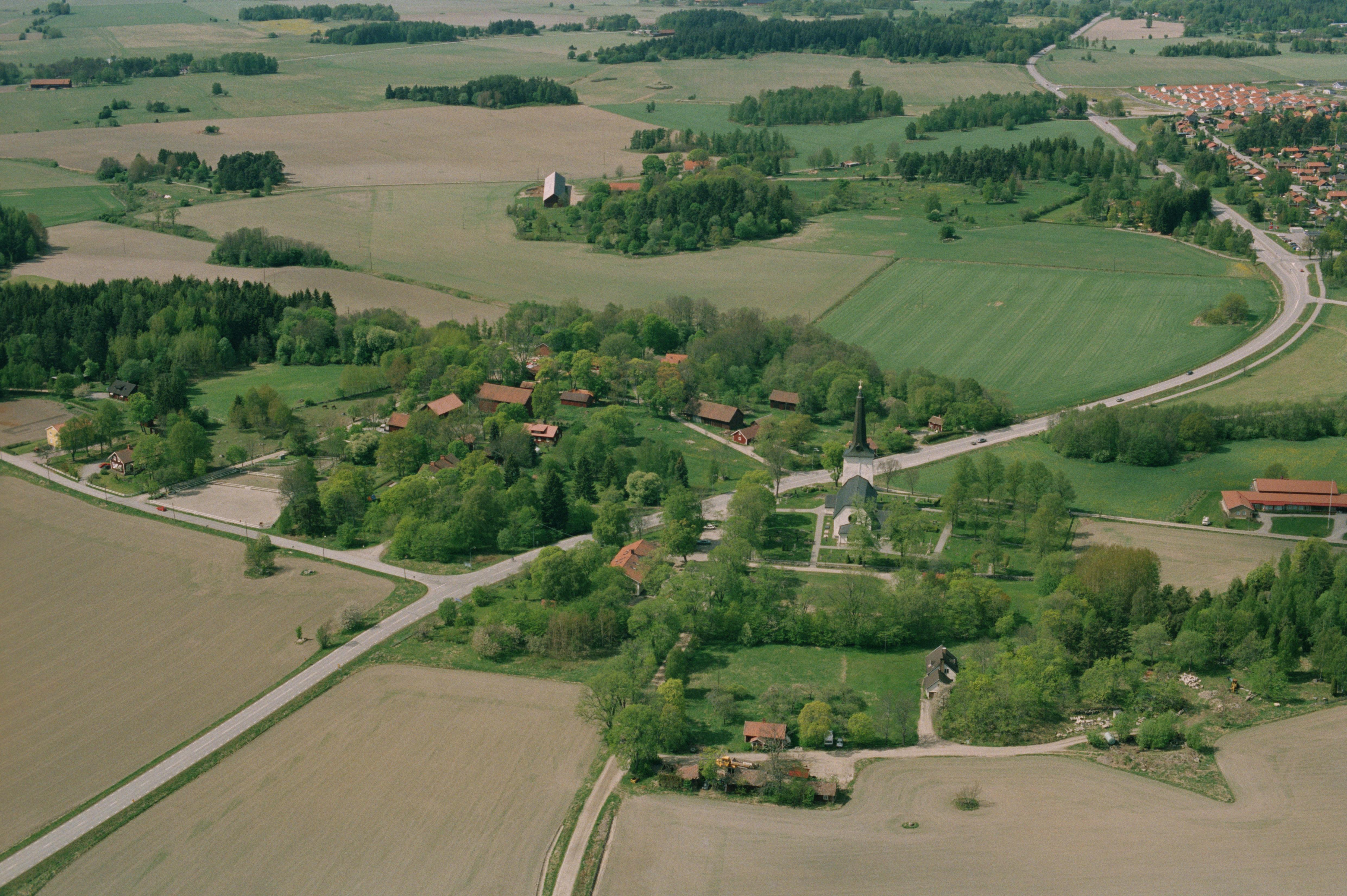 Beskrivning: Irsta tätort. Irsta kyrka i Gullbobäckens dalgång. Bilden är tagen mot (väderstreck): V