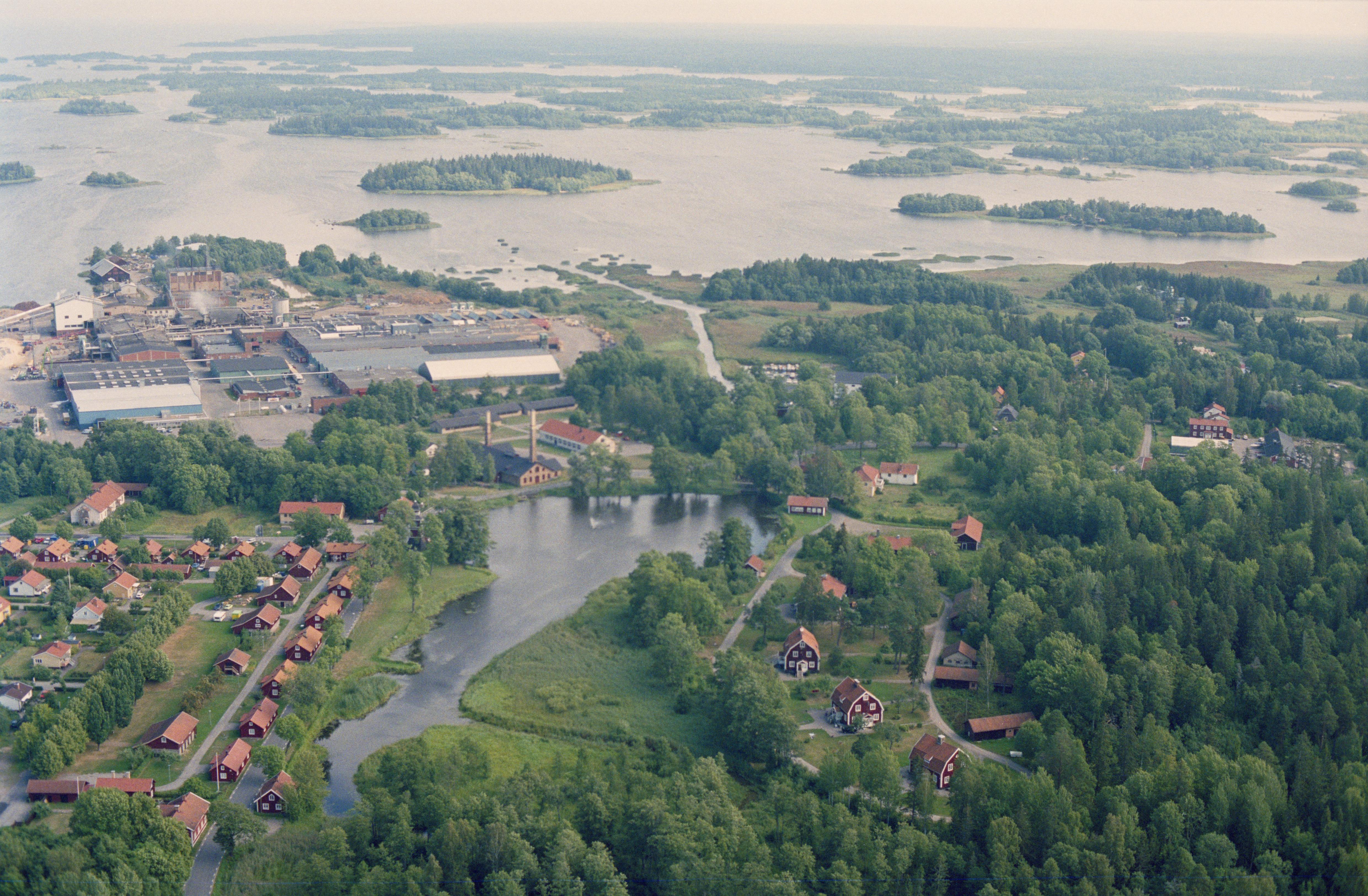 Beskrivning: Karlholmsbruk (skrivs även Karlholms bruk) vid Storån i tätorten Karlholm. Byggnadsminnen hammare och smedja RAÄnr Västland 332 vid brukssjön Dammen. Karlholmsfjärden i bildens övre del. Karlholms kyrka till höger över bildens mitt. Bilden är tagen mot (väderstreck): NO