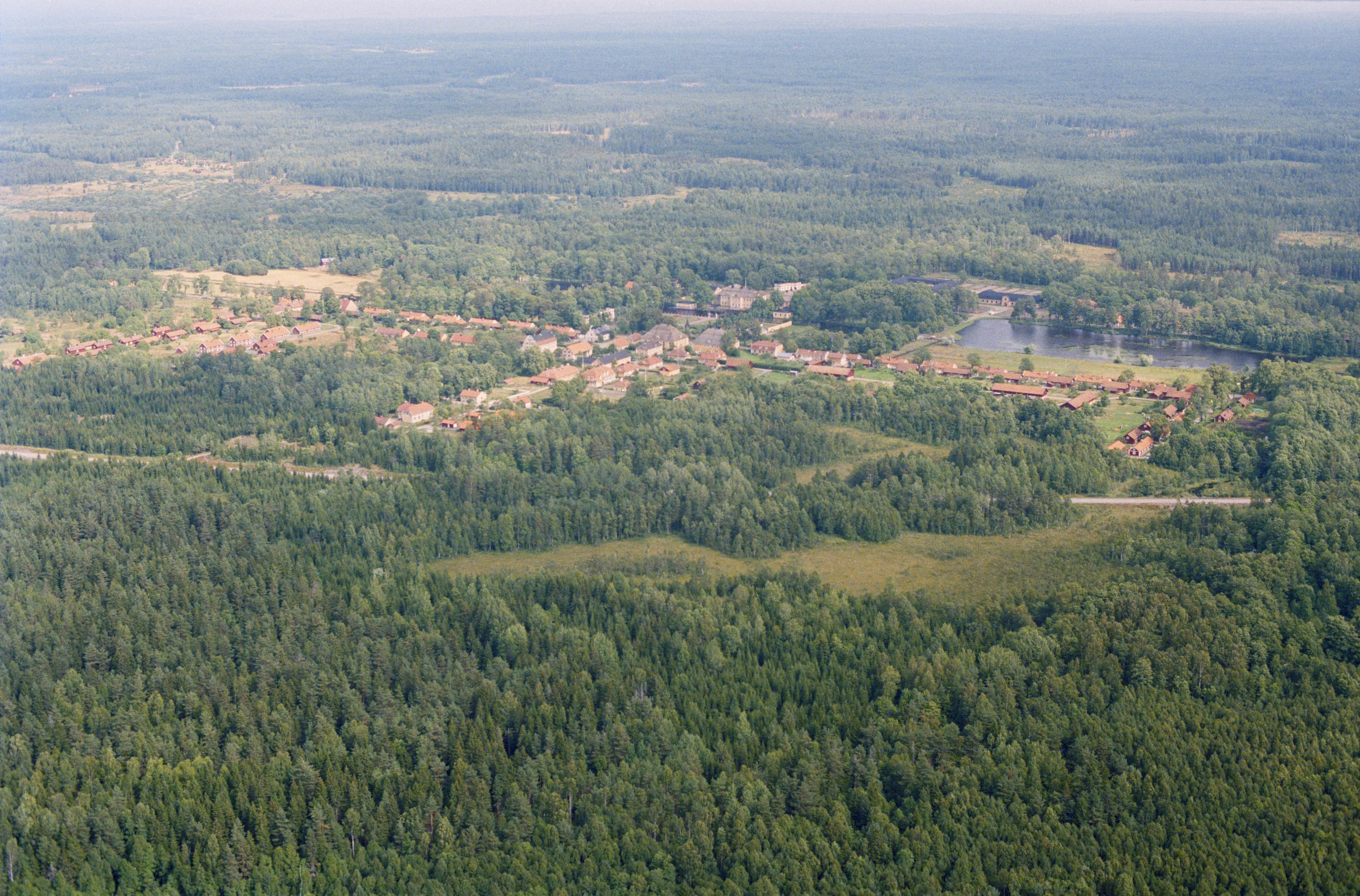 Beskrivning: Lövstabruk (byggnadsminne; skrivs även Lövsta bruk / Leufsta bruk) vid Upplandsleden. Lövstabruks kyrka och herrgård med engelsk park RAÄnr Österlövsta 252-254 vid Bruksdammen vid bildens mitt. Bilden är tagen mot (väderstreck): NO