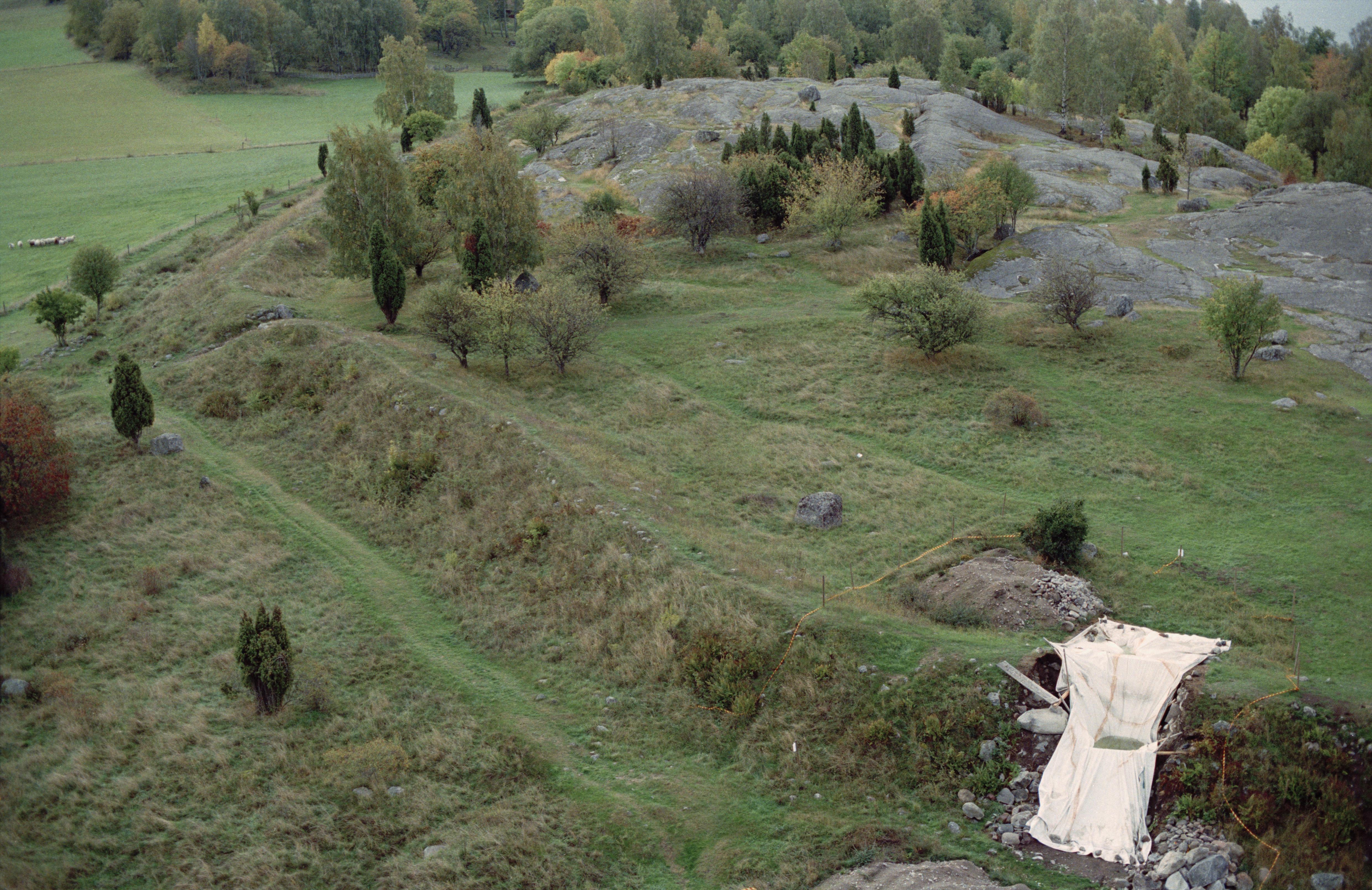 Beskrivning: Fornlämningsområdet Birka på Björkö i Mälaren. Fornborg Borg RAÄnr Adelsö 34:1 i området Garnisonen vid Ansgarsmonumentet och gravfält Borgs hage Adelsö 35:1. Till höger arkeologisk undersökning i fornborgsvallen. Bilden är tagen mot (väderstreck): S