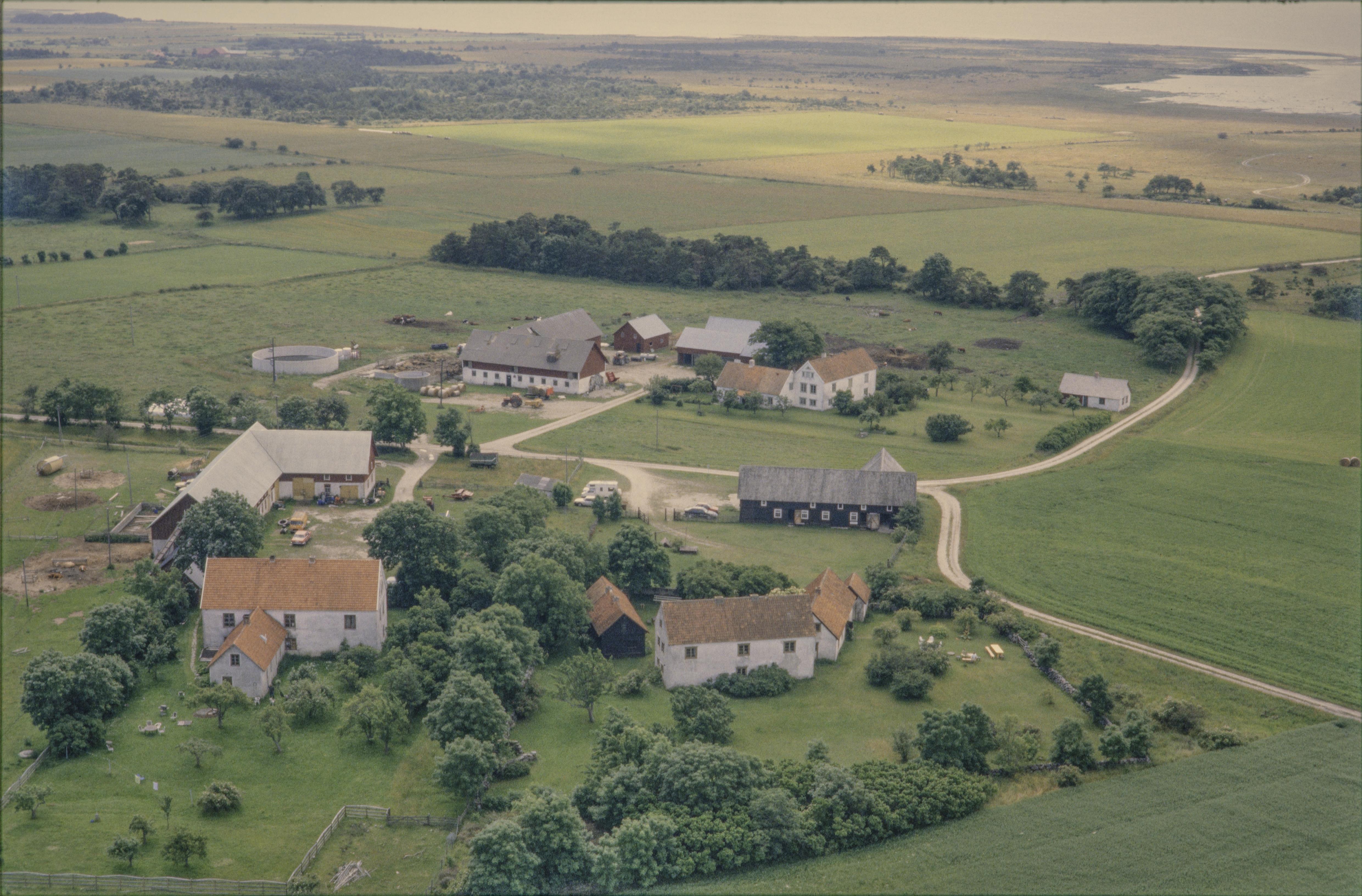Beskrivning: Petes gård och museigård. Byggnadsminne nummer Hablingbo Petes 2:1. I bildens övre del område med svärdslipningssten RAÄnr Hablingbo 9:1. Bilden är tagen mot (väderstreck): S