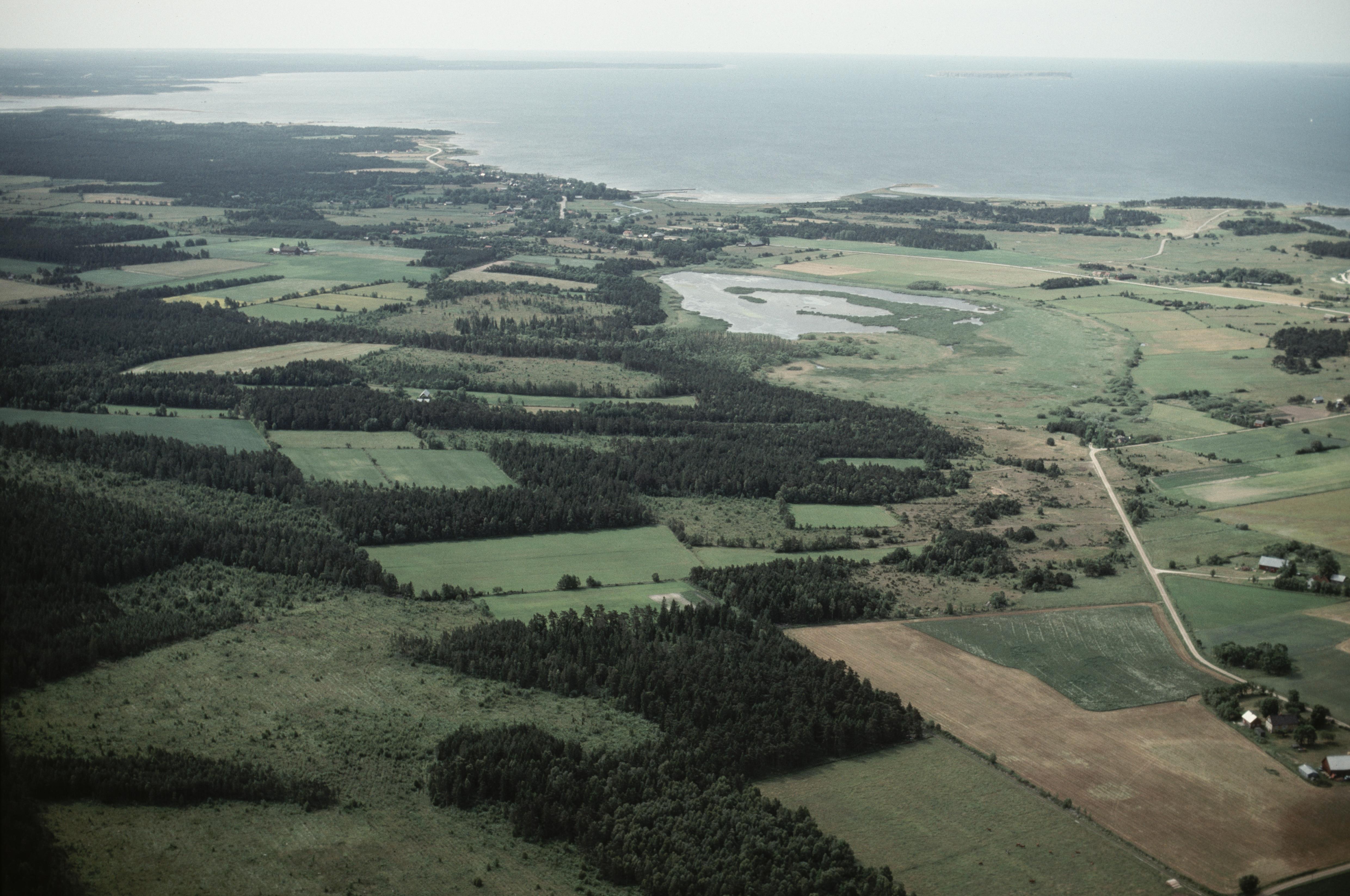 Beskrivning: Paviken, en vikingatida hamn- och handelsplats. I området bo- och gravplatser RAÄnr Västergarn 65:1 m.fl. Till vänster över bildens mitt Västergarns kyrkby. Kronholmen till höger. Sanda socken uppe till vänster. Bilden är tagen mot (väderstreck): SV