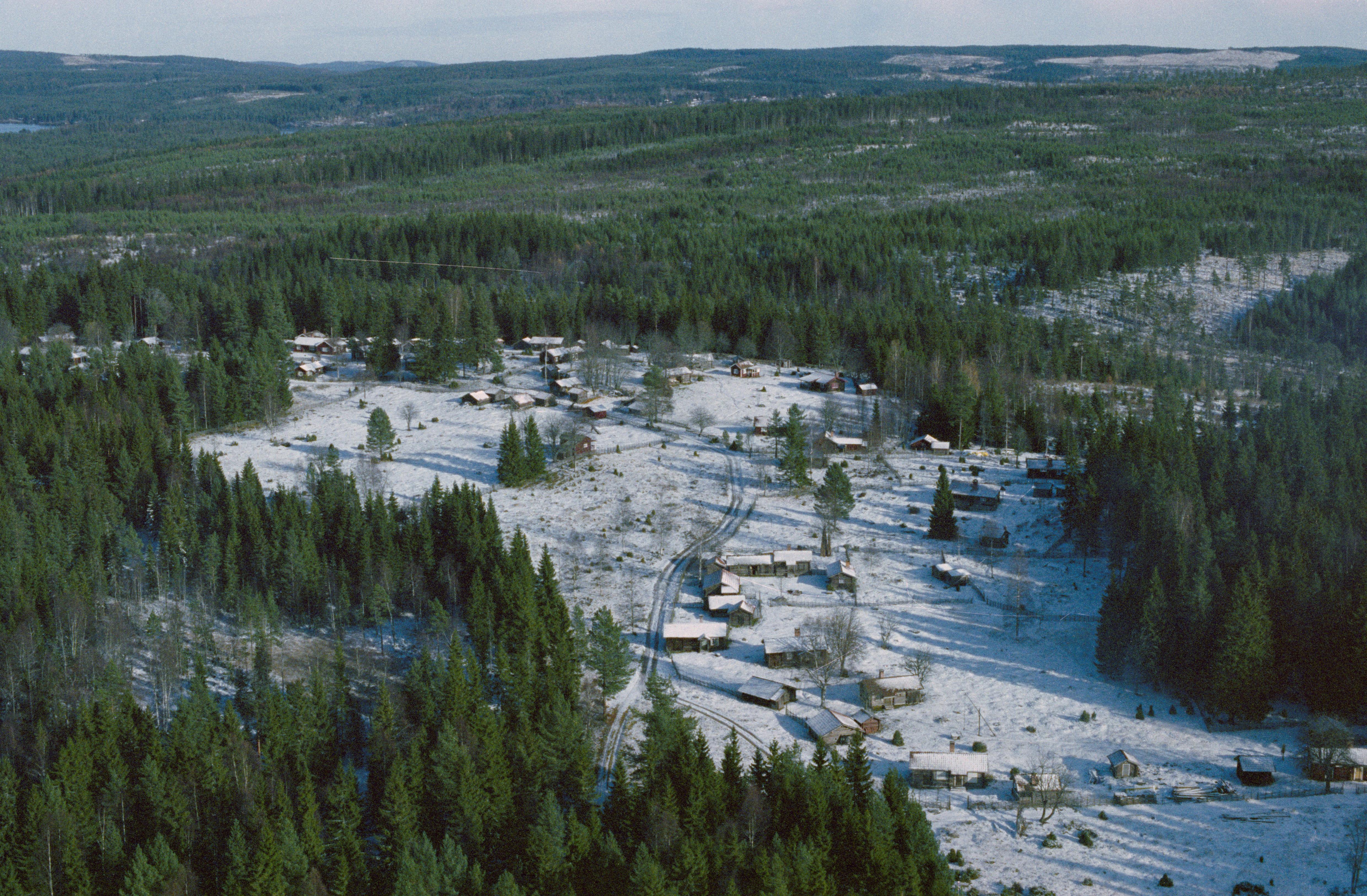 Beskrivning: Bastbergets fäbodmiljö RAÄnr Gagnef 39:1. Under bildens mitt fäbodar med nummer 101, 103, 105 m.fl. i södra delen av byn. Bilden är tagen mot (väderstreck): NO