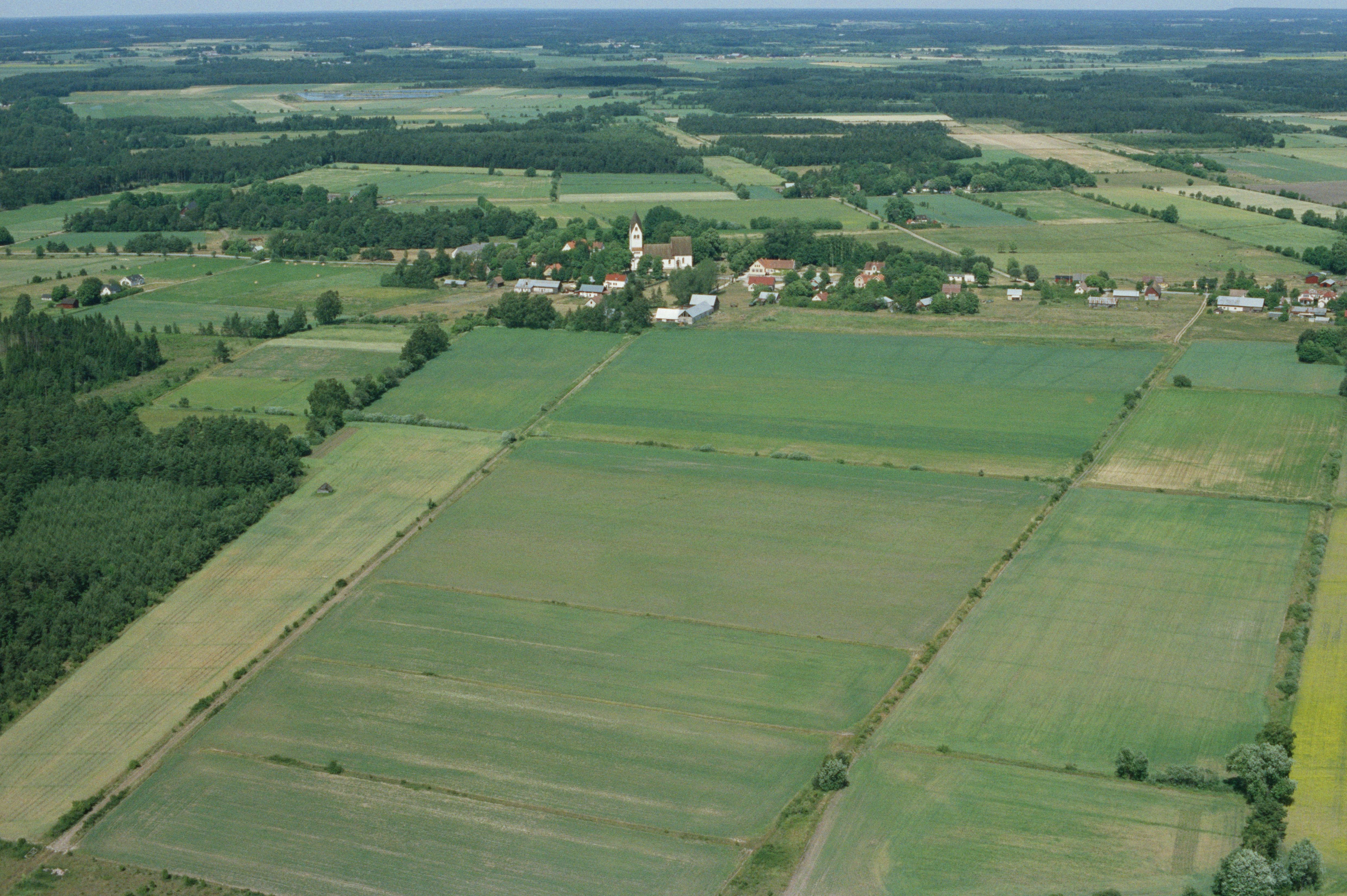 Beskrivning: I bildens nedre del området väster om Sigdes by. Bandlunde kyrka och kyrkby över bildens mitt. Till vänster om bildens mitt område med tjärdal/tjärgrop RAÄnr Burs 235. Bilden är tagen mot (väderstreck): N