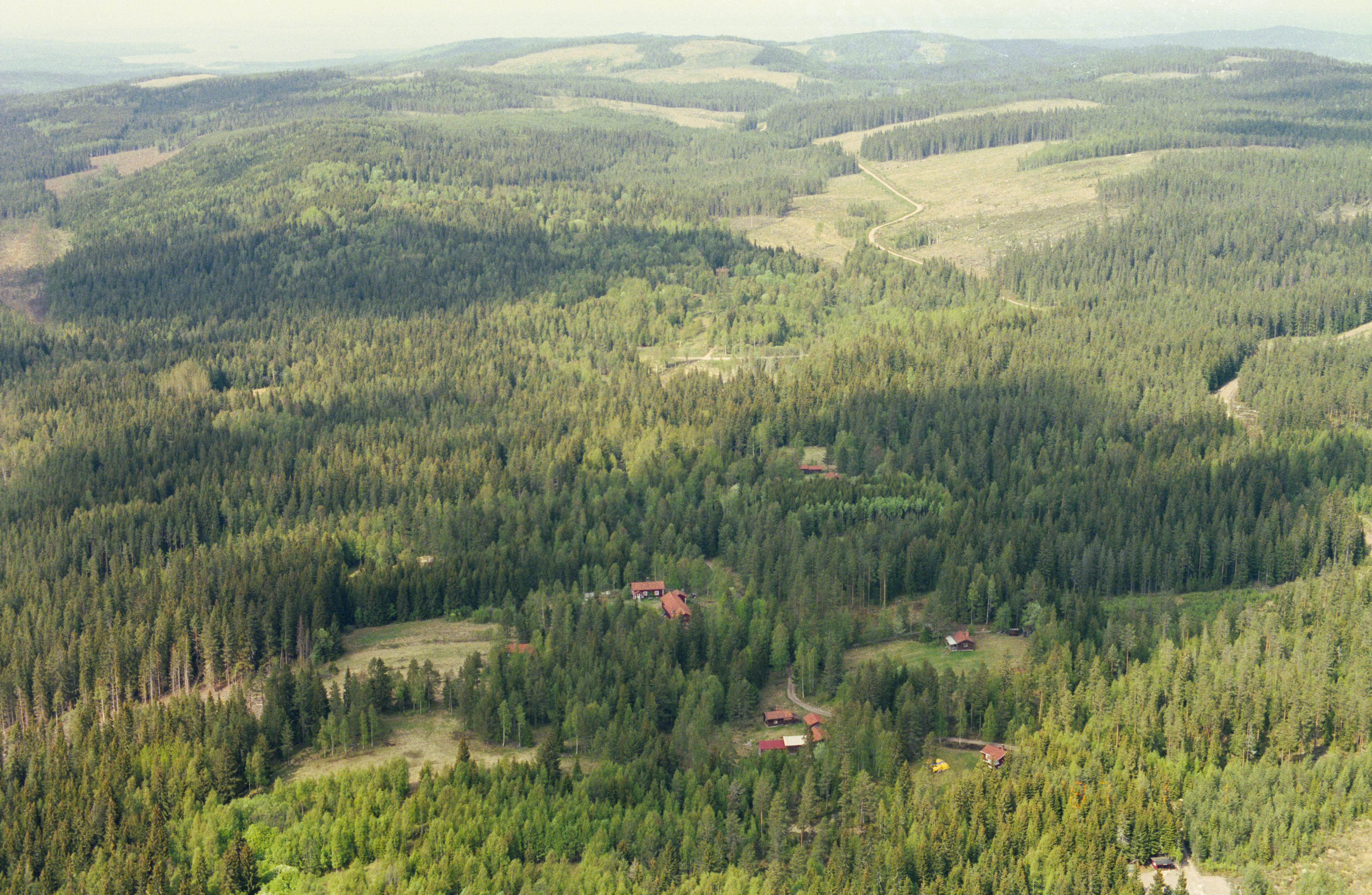Beskrivning: Björntjärnsbäckens dalgång. Dammskogs fäbodmiljö RAÄnr Leksand 682:1-4 i bildens nedre del. Över bildens mitt byn Skallskog. Bilden är tagen mot (väderstreck): N