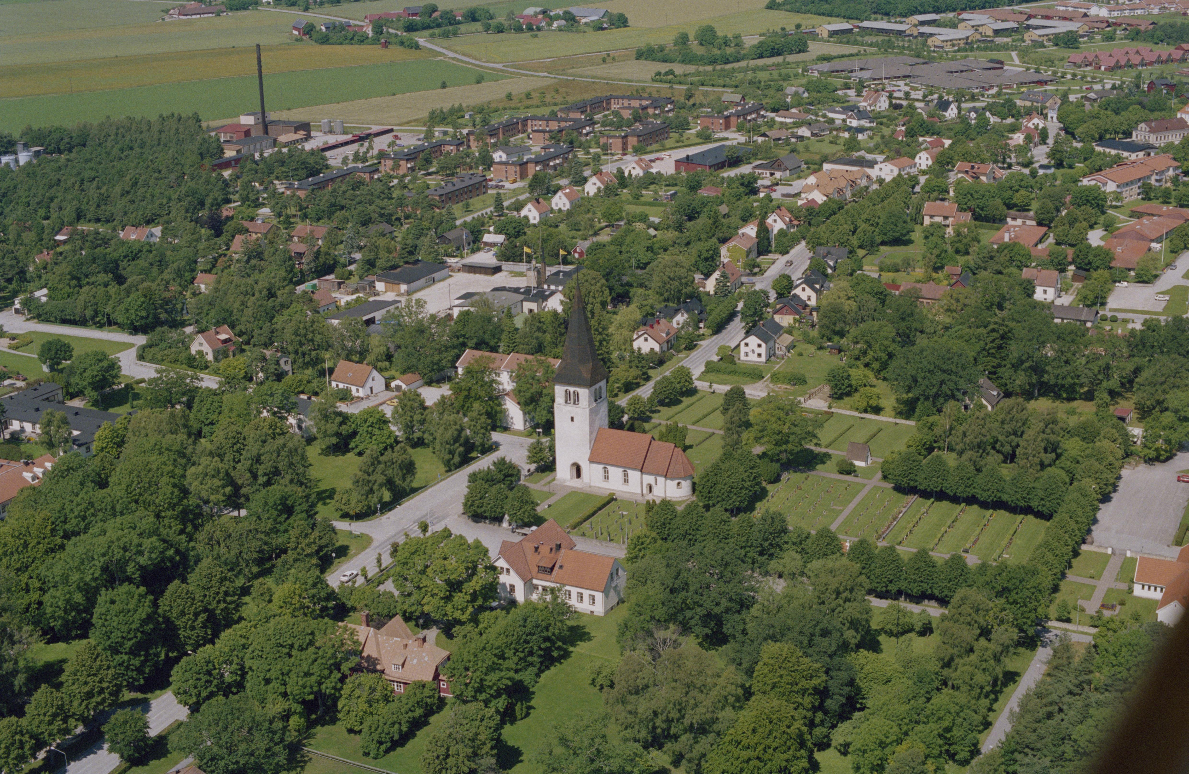 Beskrivning: Hemse tätort. Hemse kyrka i bildens mitt. I kyrkan lämningar efter en äldre kyrka RAÄnr Hemse 49:1. Bilden är tagen mot (väderstreck): NV