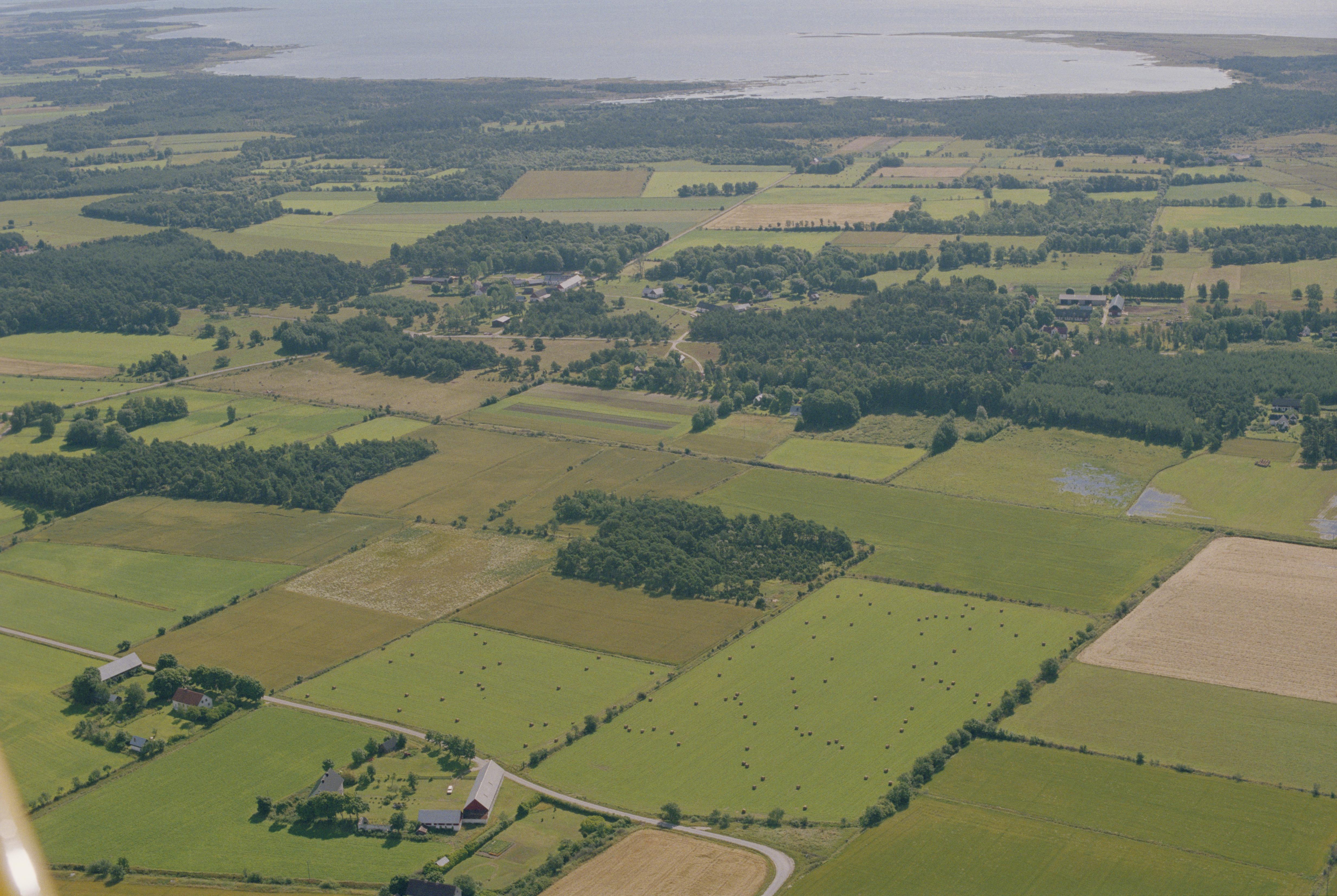 Beskrivning: Fornlämningsområdet Bandlundeviken. Över bildens mitt området Strandhagen med stensättningar RAÄnr Burs 182:1-2 och stenar med slipyta Burs 180:1, 188:1, 192:1 m.fl. Näset Hummelbosholm uppe till höger. Gränsen mot Rone socken i bildens nedre del. Bilden är tagen mot (väderstreck): SO