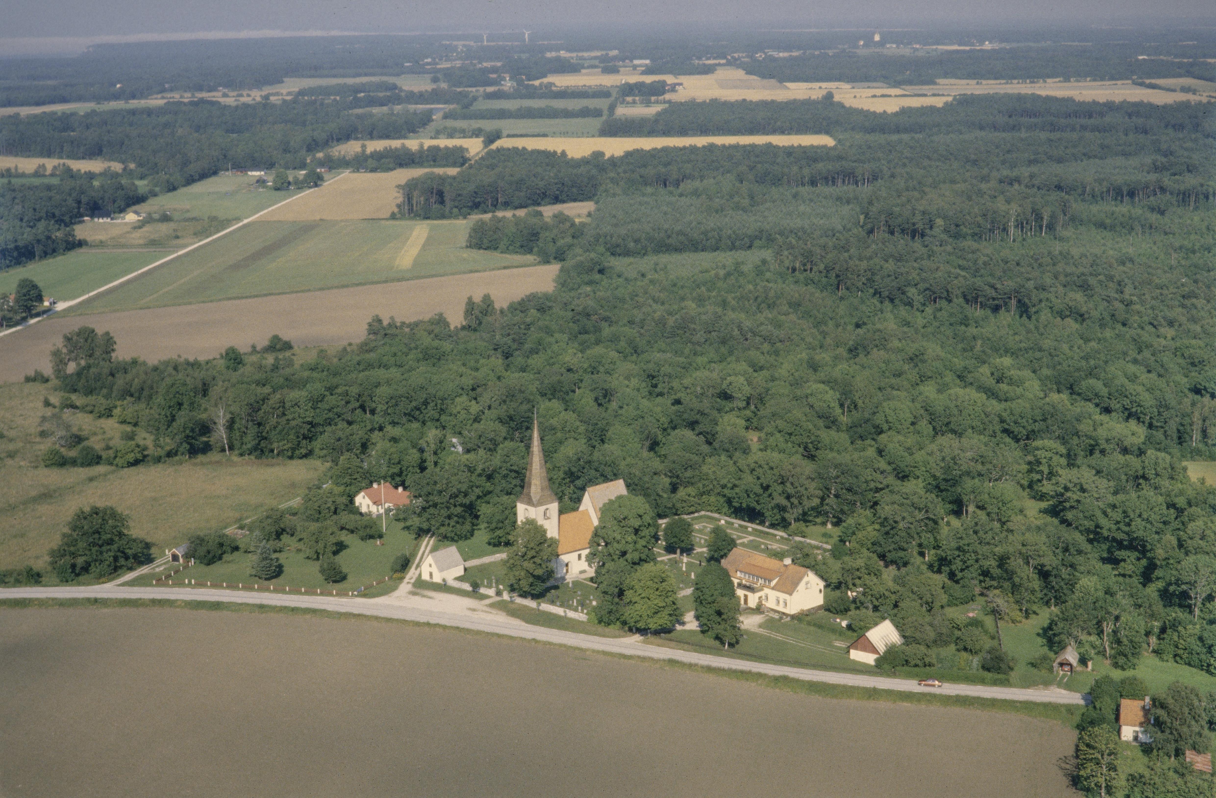 Beskrivning: Lummelunda kyrkby. Lummelunda kyrka under bildens mitt. Till höger om kyrkan fossil åker RAÄnr Lummelunda 128:1. Bilden är tagen mot (väderstreck): NO
