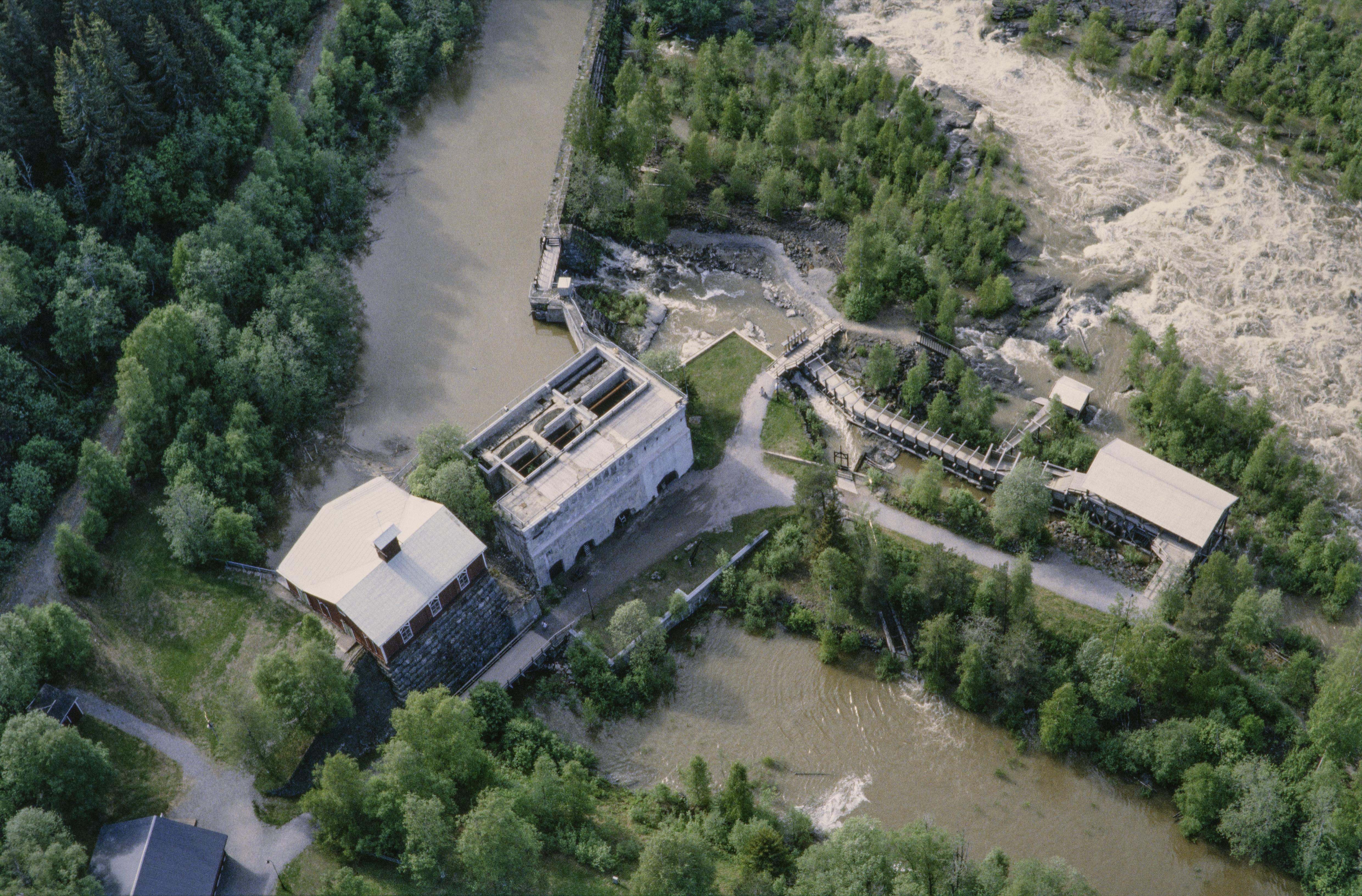 Beskrivning: Klabböle kraftverk i Baggböleforsen där Storbäcken möter Umeälven. Bilden är tagen mot (väderstreck): NV