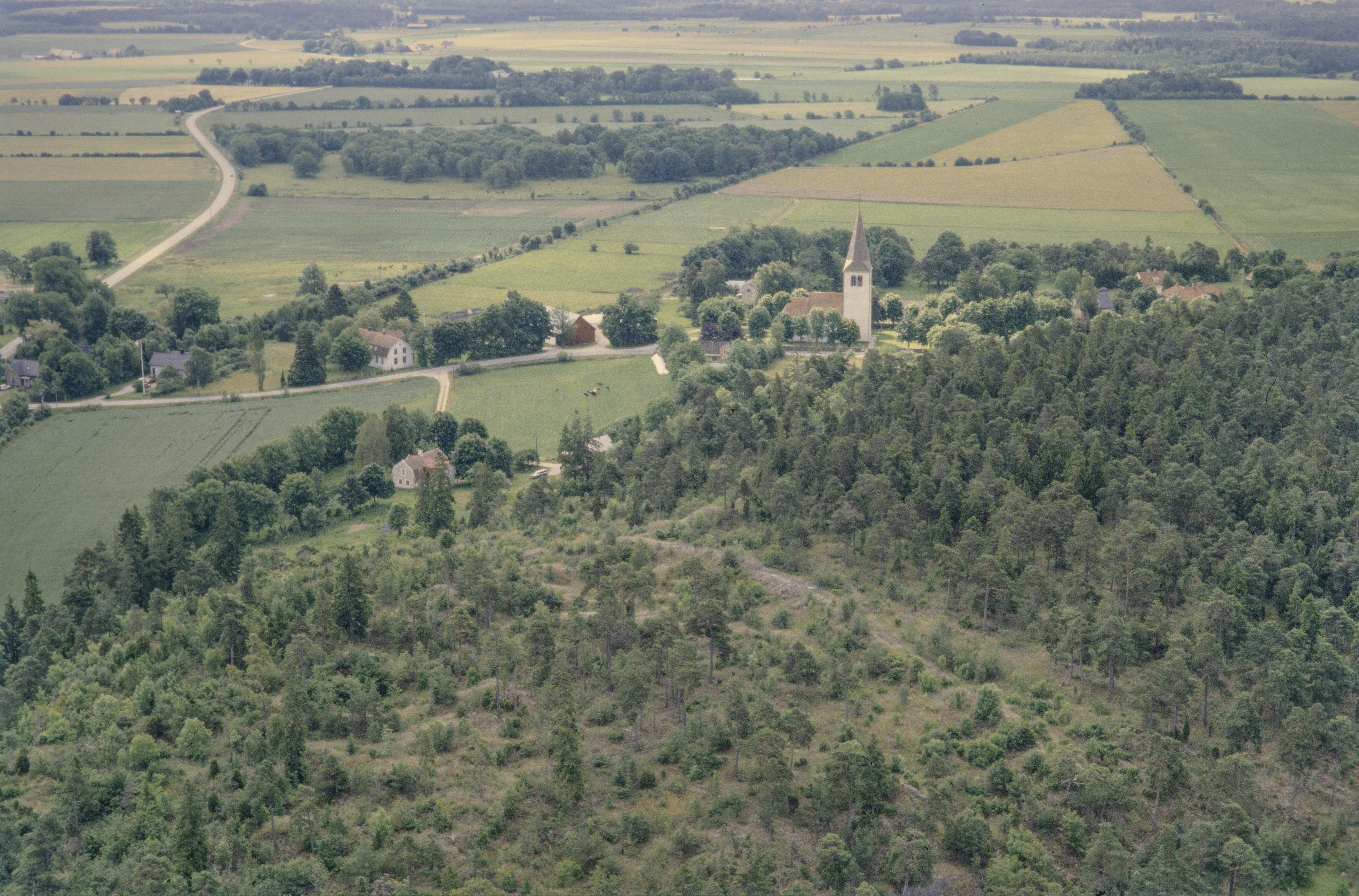 Beskrivning: Över bildens mitt Linde kyrka och kyrkby. I bildens nedre del fornborg RAÄnr Linde 5:1 på Lindeberget. Socknet Fardhem i bildens övre kant. Bilden är tagen mot (väderstreck): S