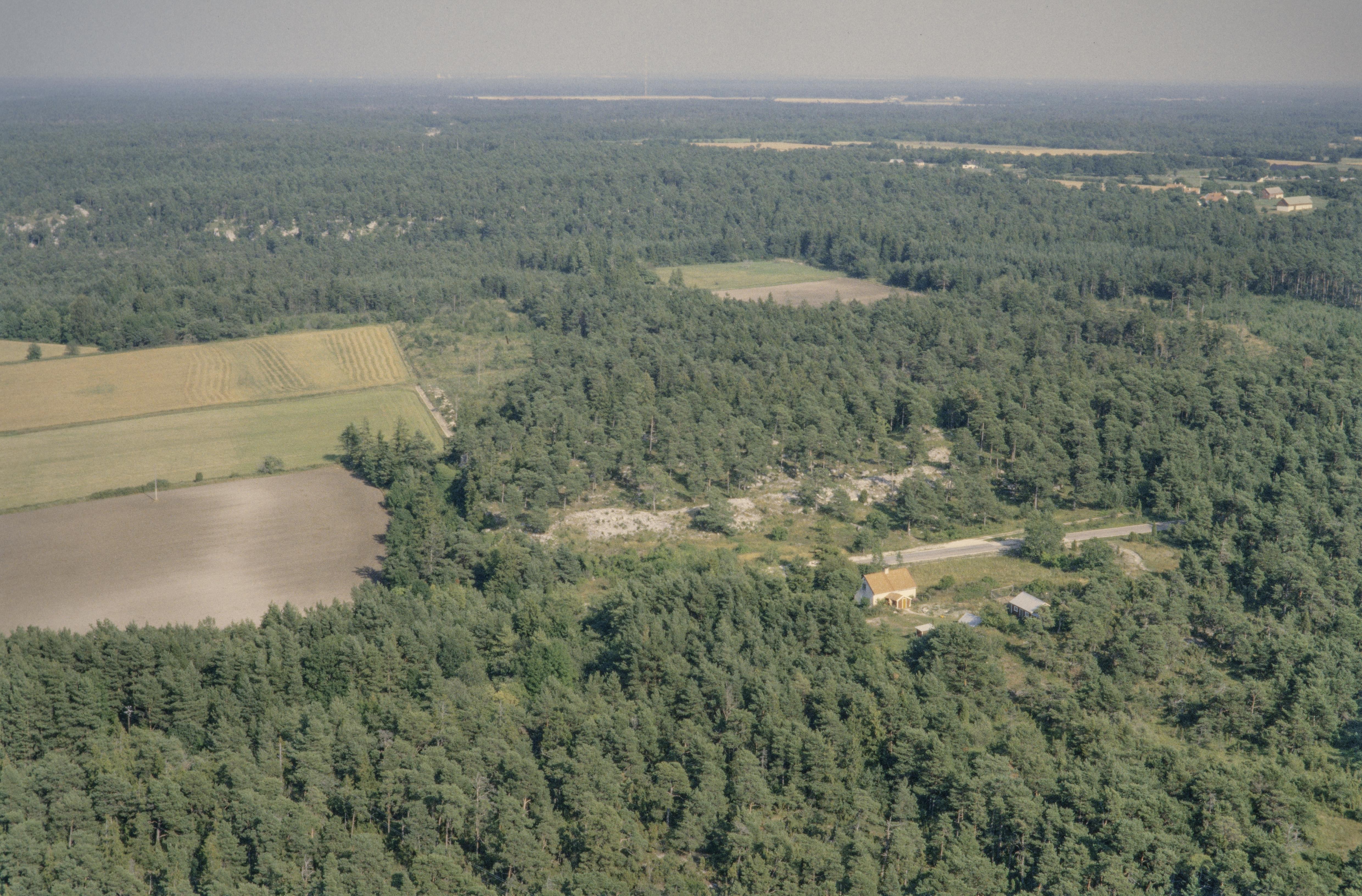 Beskrivning: Området Grausne, sydost om fiskeläget Lickershamn. Vid bildens mitt fornborg RAÄnr Stenkyrka 22:1 vid färdväg Stenkyrka 250. Bilden är tagen mot (väderstreck): OSO