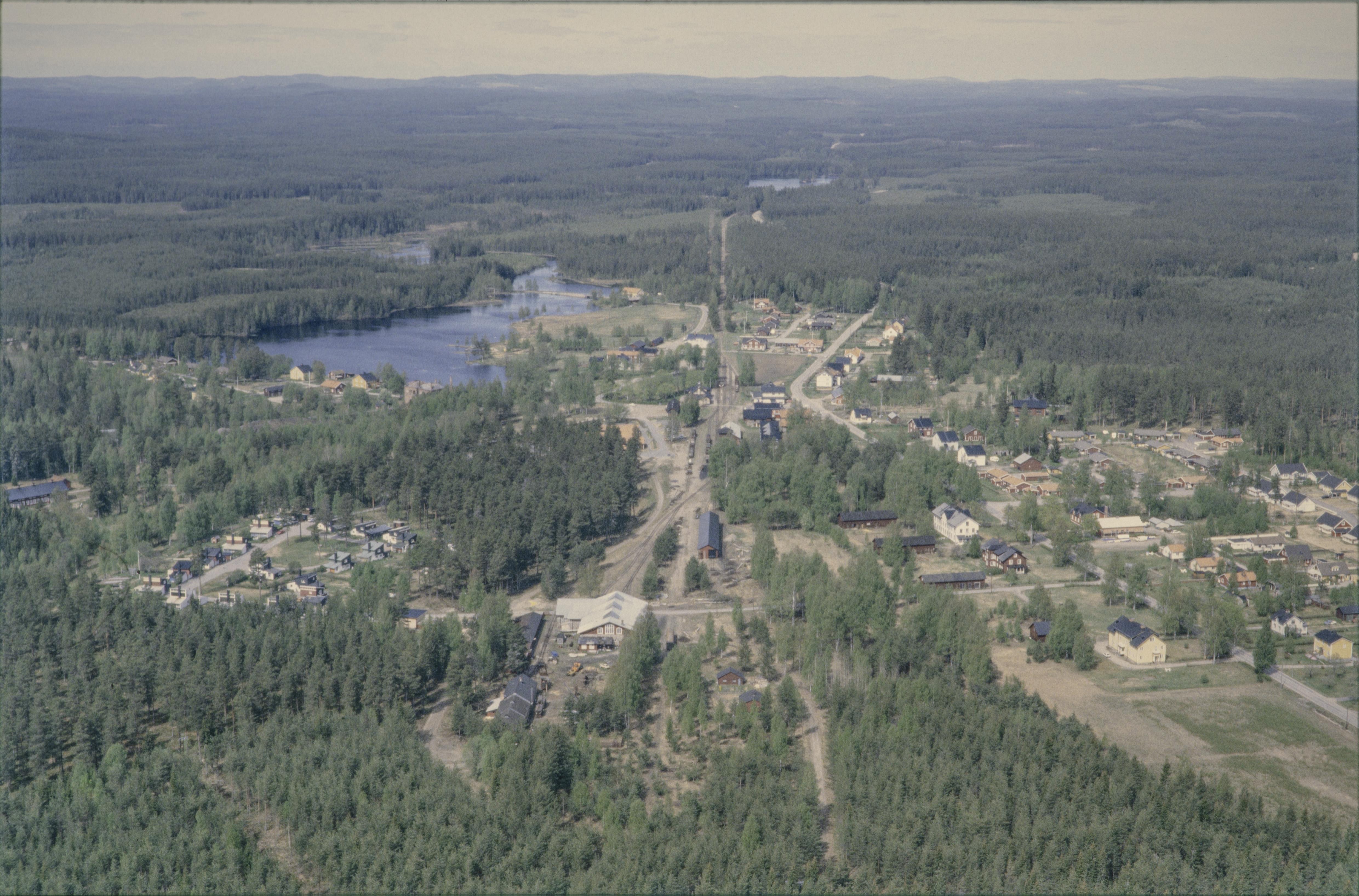 Beskrivning: Jädraås bruk vid Jädraån. Bruksherrgård, hytta, smedja, järnvägsstation m.m. Till vänster över bildens mitt ett område med fångstgropar RAÄnr Ockelbo 253:1, m.fl. Bilden är tagen mot (väderstreck): NV