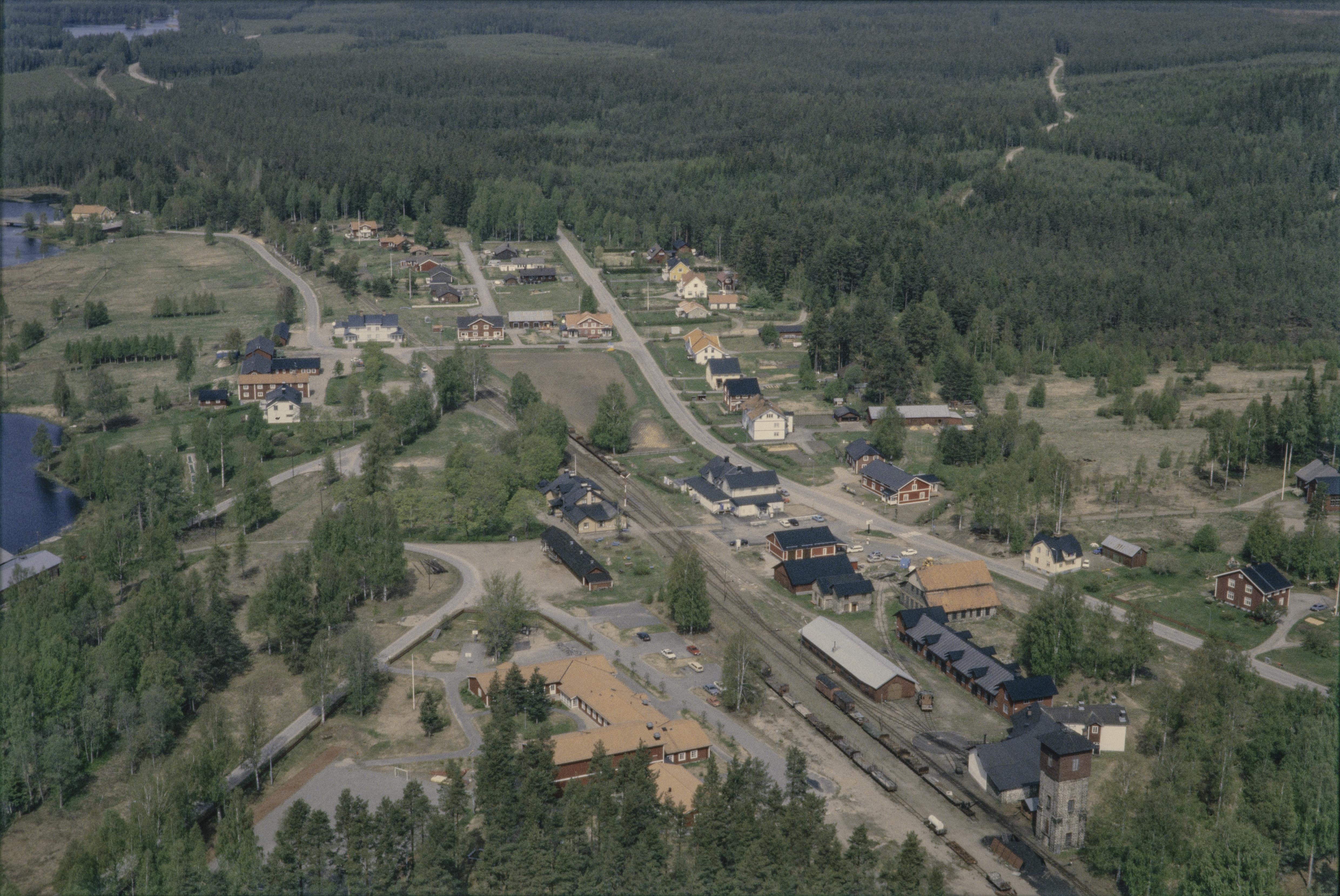 Beskrivning: Jädraås bruk vid Jädraån. Bruksherrgård, hytta, smedja, järnvägsstation (vid bildens mitt) m.m. Jädraås herrgård till vänster över bildens mitt. I skogen uppe till höger ett område med fossil åker RAÄnr Ockelbo 1629. Bilden är tagen mot (väderstreck): NNV
