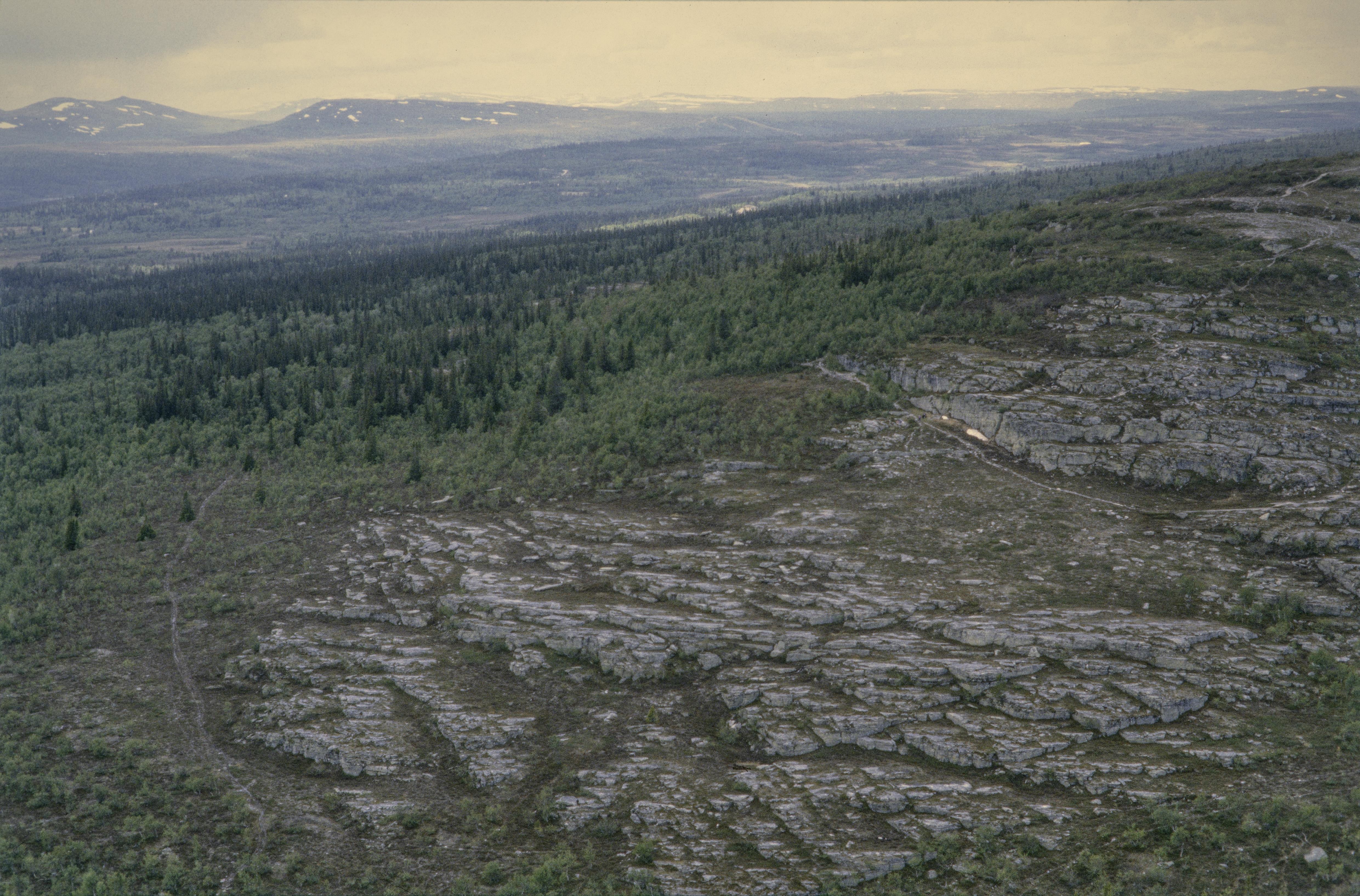 Beskrivning: Östra delen av lågfjället Flatruet (Fleete) vid bergstoppen Ruändan (Sjnjaptjegietije). I bergsidan till höger om bildens mitt en lodrätt klippvägg med hällmålningar RAÄnr Tännäs 58:1. Bilden är tagen mot (väderstreck): V