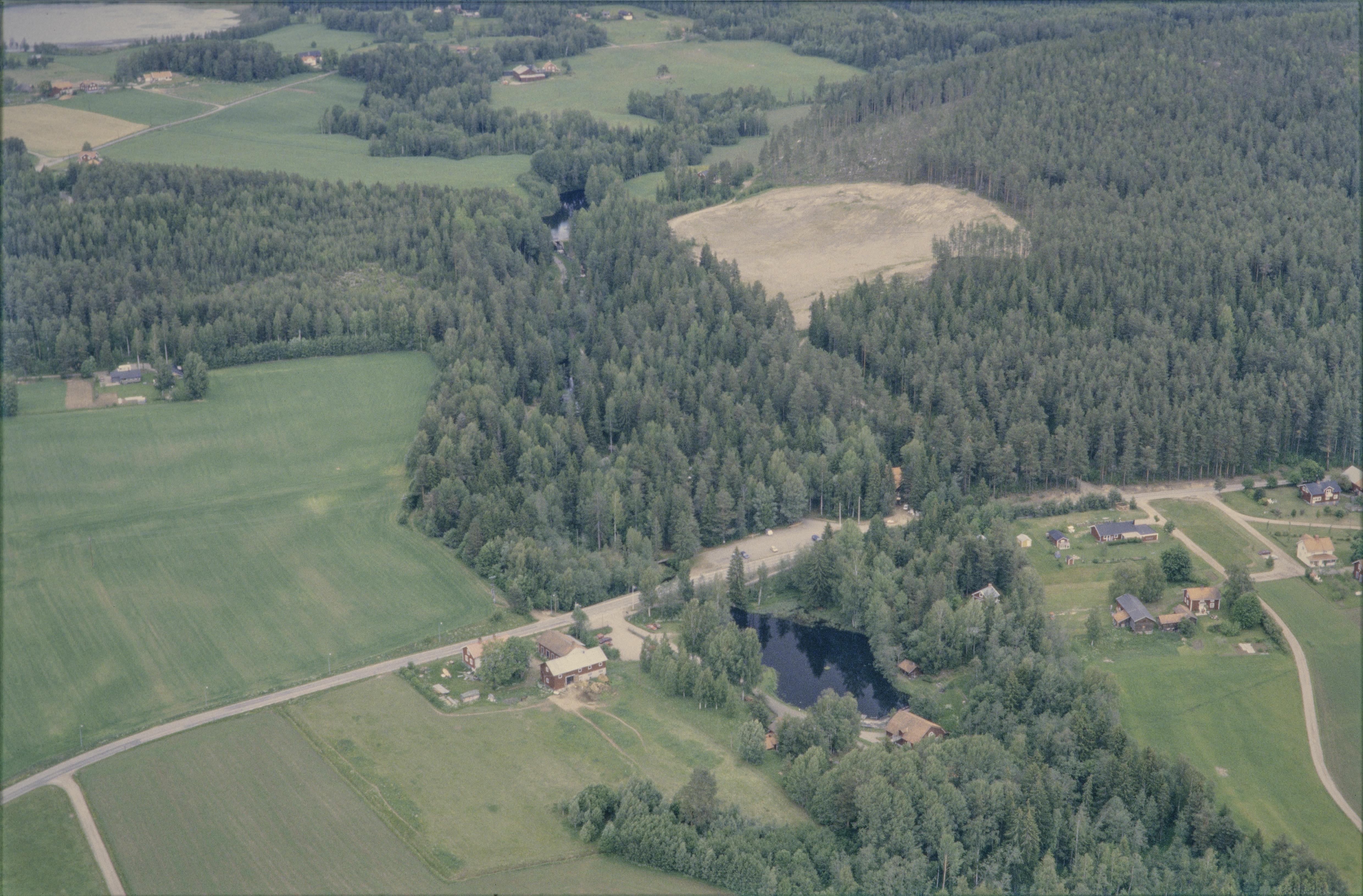 Beskrivning: Växbo by, östra delen vid Växbo kvarn och Sörom. Över bildens mitt Trolldalen RAÄnr Bollnäs 417:1 i Vaxboåns dalgång. Vid bildens mitt bro RAÄnr Bollnäs 489:1 vid gravfält Bollnäs 33:1. Bilden är tagen mot (väderstreck): NNO