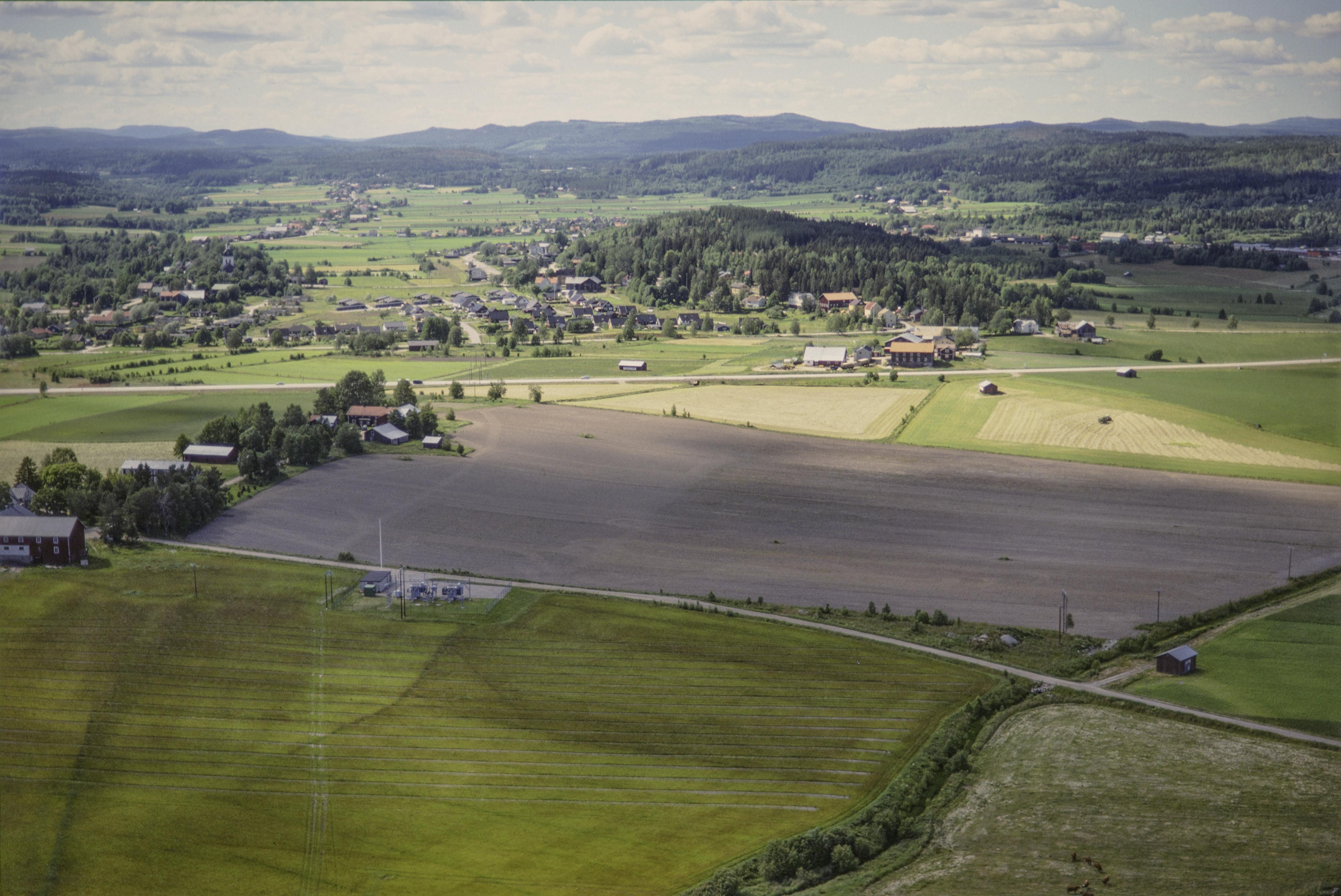 Beskrivning: Västra delen av Gnarps tätort och kyrkby i Gnarpsåns dalgång. Gnarps kyrka skymtas vid Bergsberget över bildens mitt. Gården Rogsta i kanten till vänster om bildens mitt. Över bildens mitt området Röde med fyndplats RAÄnr Gnarp 166:1. Bilden är tagen mot (väderstreck): VNV