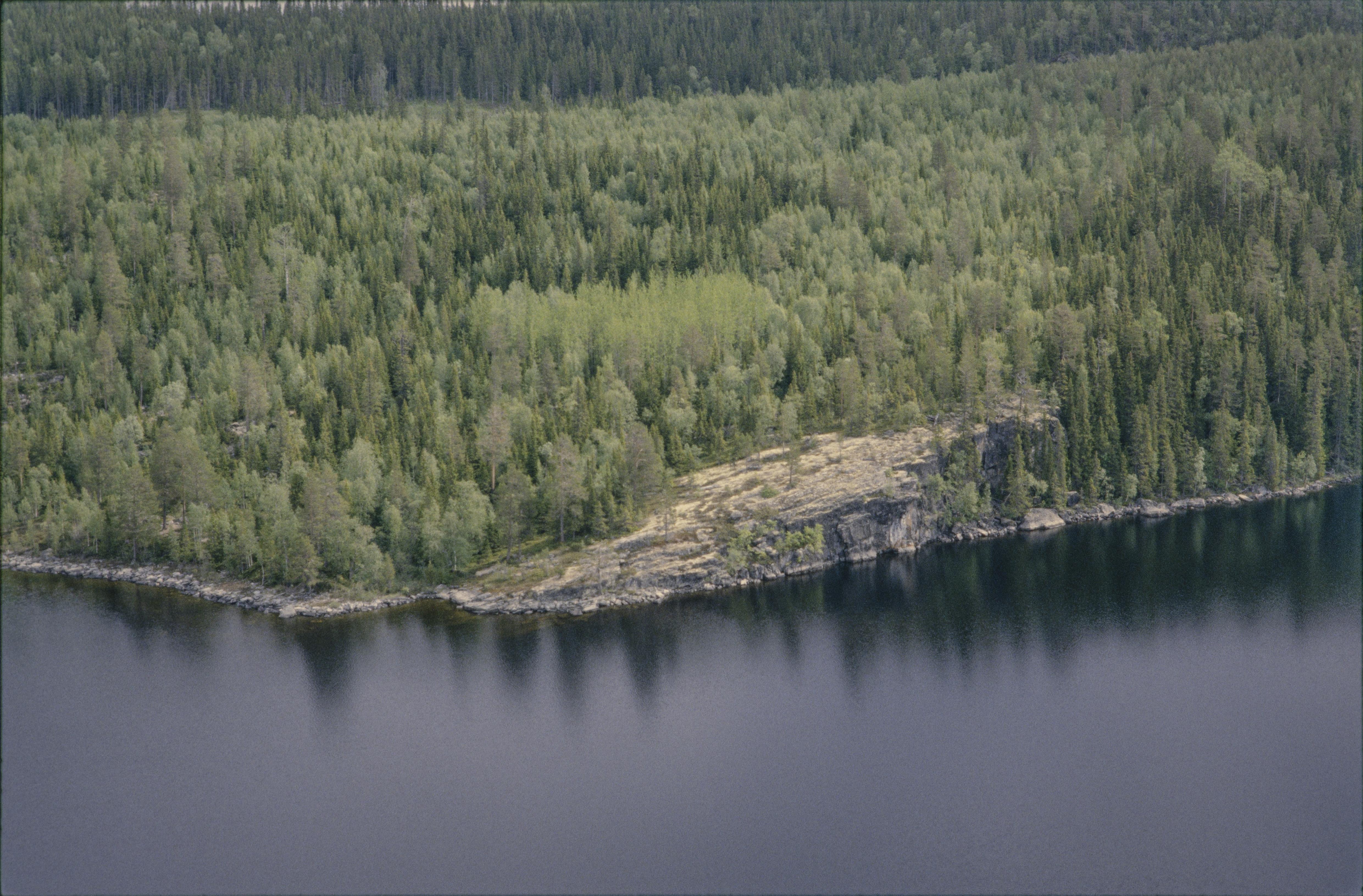 Beskrivning: Skärvångssjön norrväst om byn Norra Skärvången. Vid bildens mitt hällmålning RAÄnr Föllinge 346:1 vid Brattberget under Norsjöberget. Uppe till vänster boplats RAÄnr Föllinge 175:1. Bilden är tagen mot (väderstreck): NO
