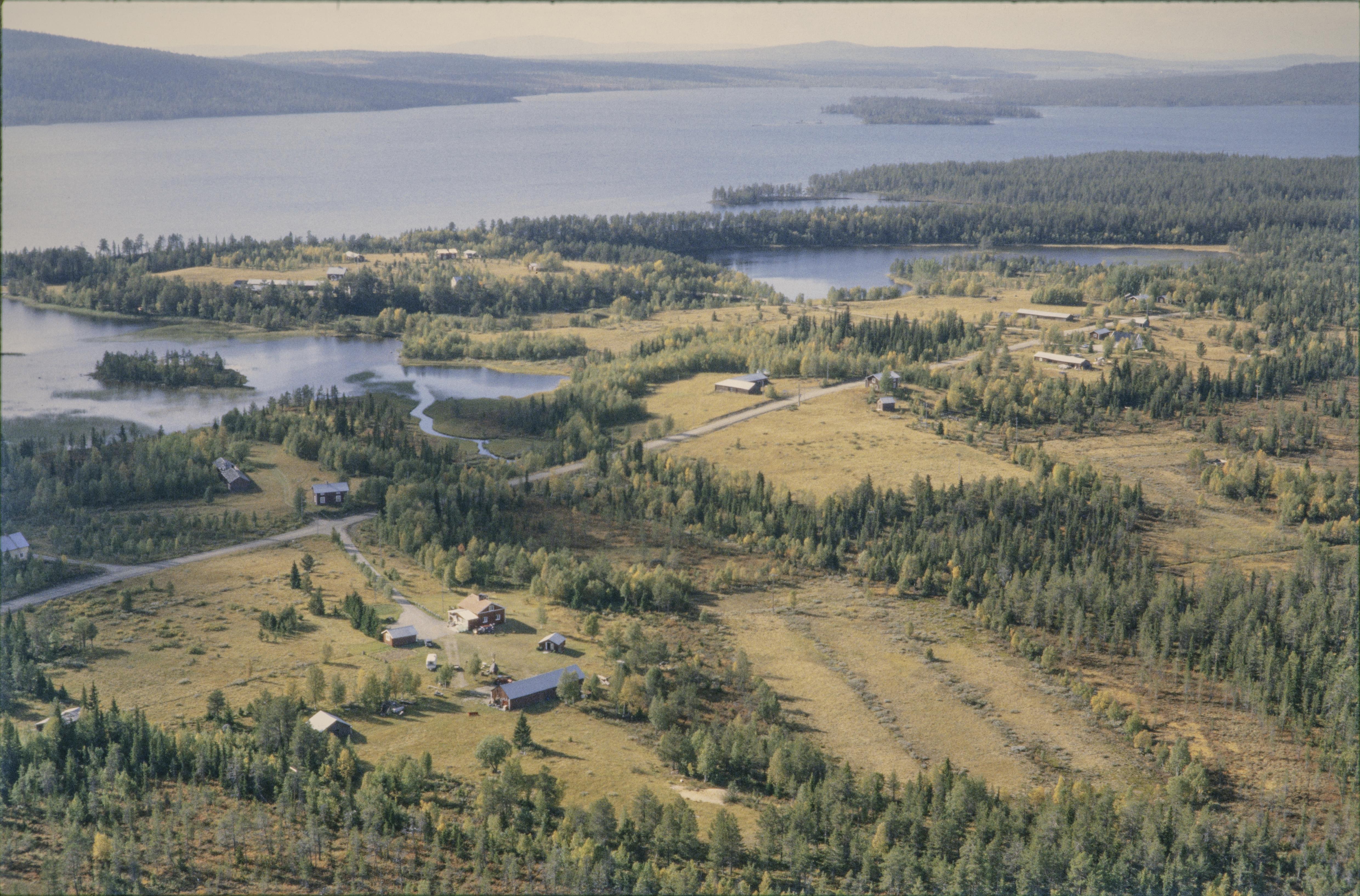 Beskrivning: Svannäs by vid sjön Gublijaure (Gubblehávrre). Uppe till höger Storstenudden med härd RAÄnr Arjeplog 1241:1, boplatser Arjeplog 485:1, 1229:1-4, 1233:1, m.fl. Bilden är tagen mot (väderstreck): VSV