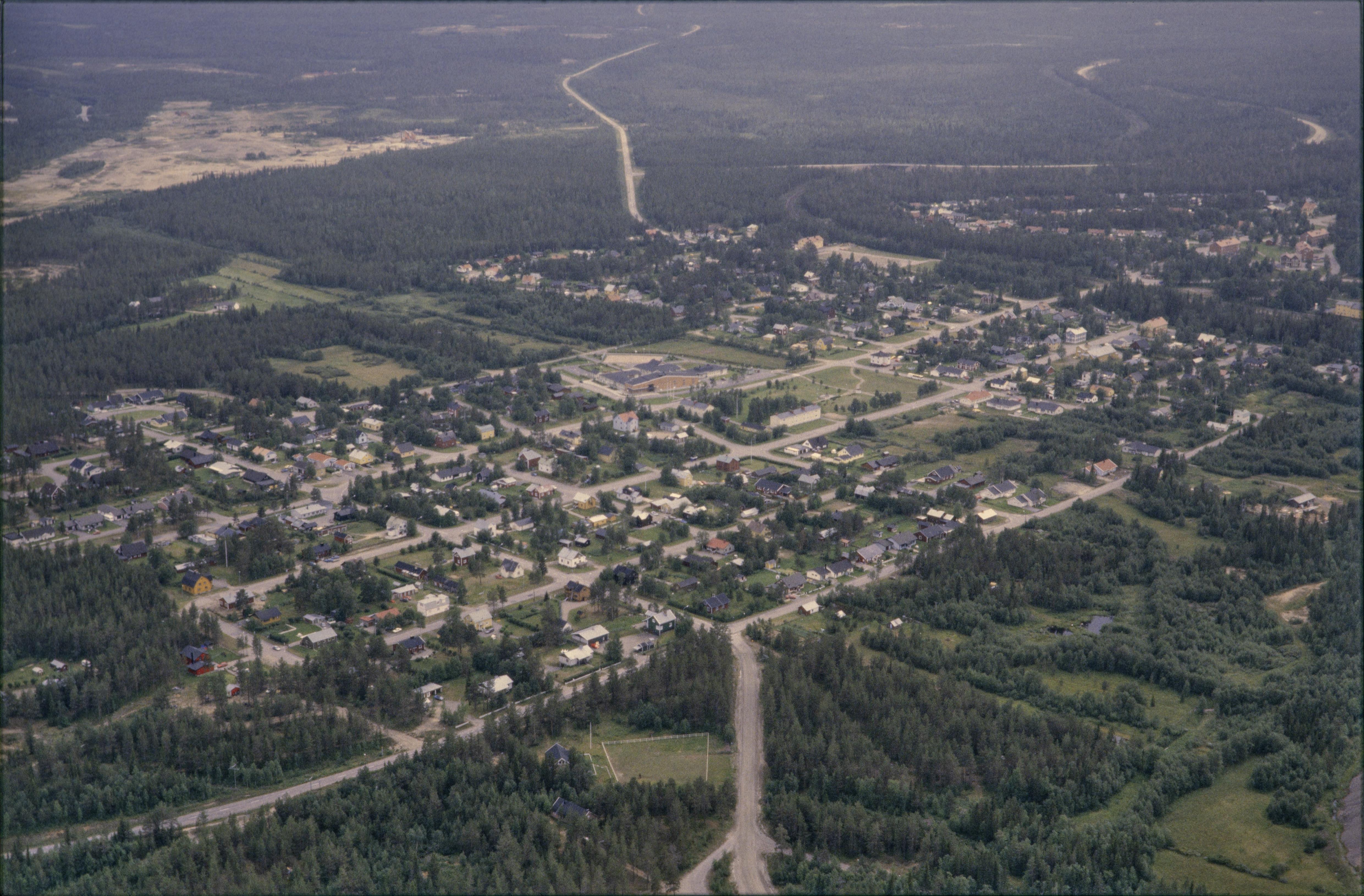 Beskrivning: Koskullskulle tätort, stationssamhälle och gruvsamhälle vid Linaälven (Lijnáädno), nordöst om tätorten Malmberget. Bilden är tagen mot (väderstreck): S