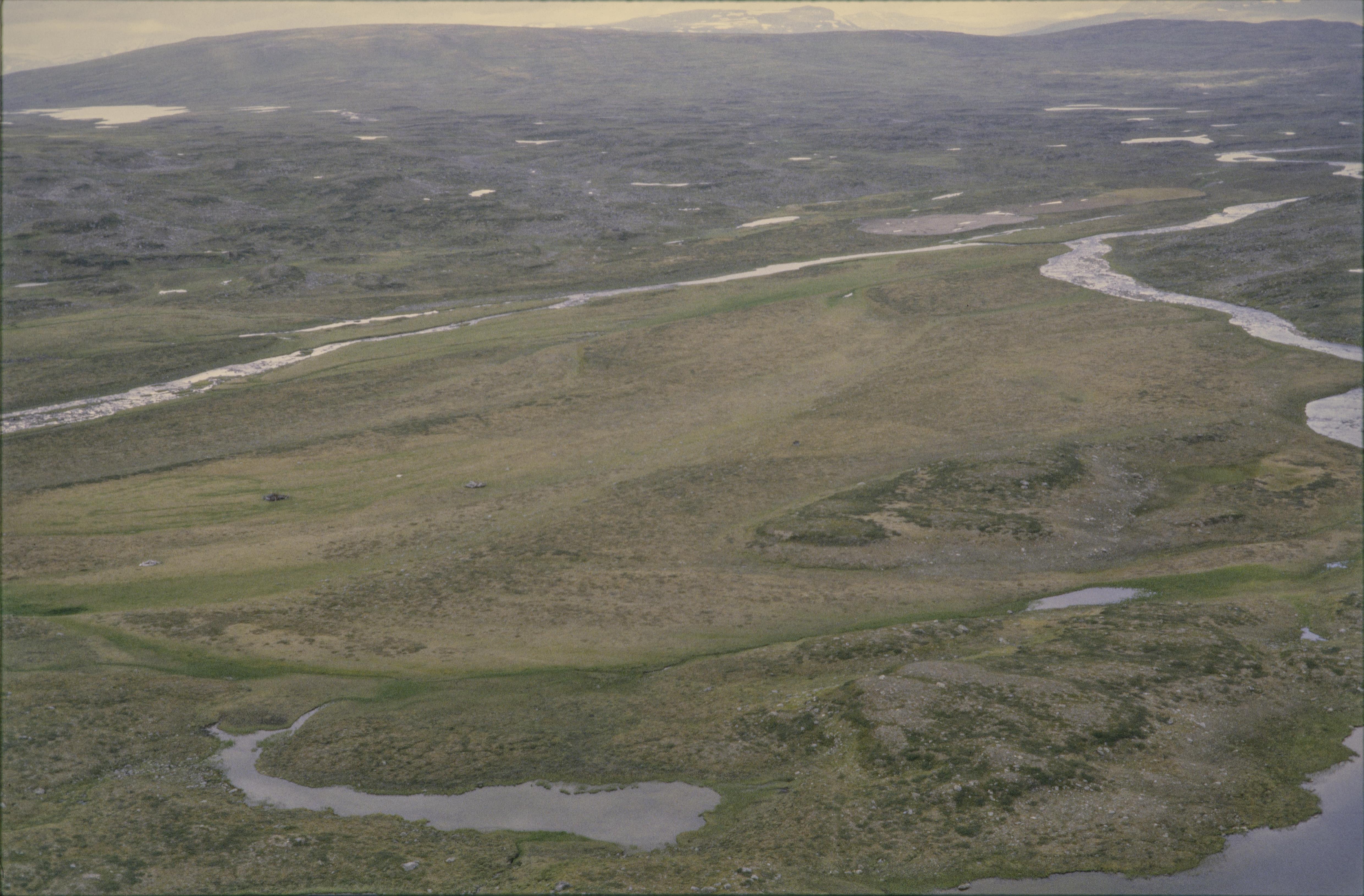 Beskrivning: Ån Sierkajåkkå (Sierggajåhkå) vid området Skuollavallda (Skuollávallda) på västsidan av fjället Kisuris (Gisuris). Vid bildens mitt renvall RAÄnr Jokkmokk 910:1, härd Jokkmokk 912:1, m.fl. Området ingår i Padjelanta (Badjelánnda) nationalpark och världsarvet Laponia. Bilden är tagen mot (väderstreck): V