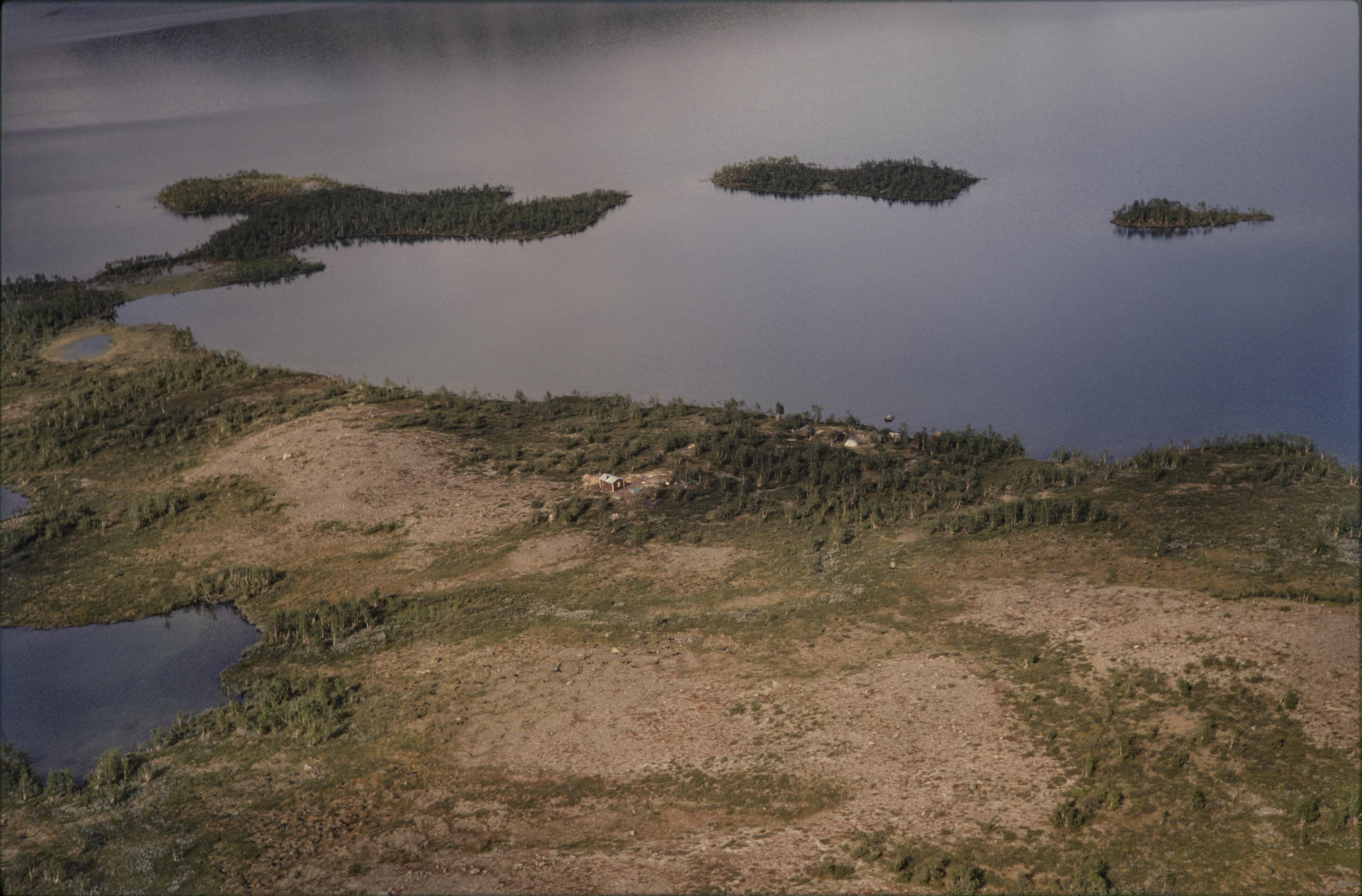 Beskrivning: Samevistet Akanjarka (Áhkánjárgga) i sydöstra ändan av sjön Sitojaure (Sijddojávrre). I bildens nedre kant boplats RAÄnr Jokkmokk 369:1 och 3486:1. Området ingår i Ultevis fjällurskogs naturreservat. Bilden är tagen mot (väderstreck): NO
