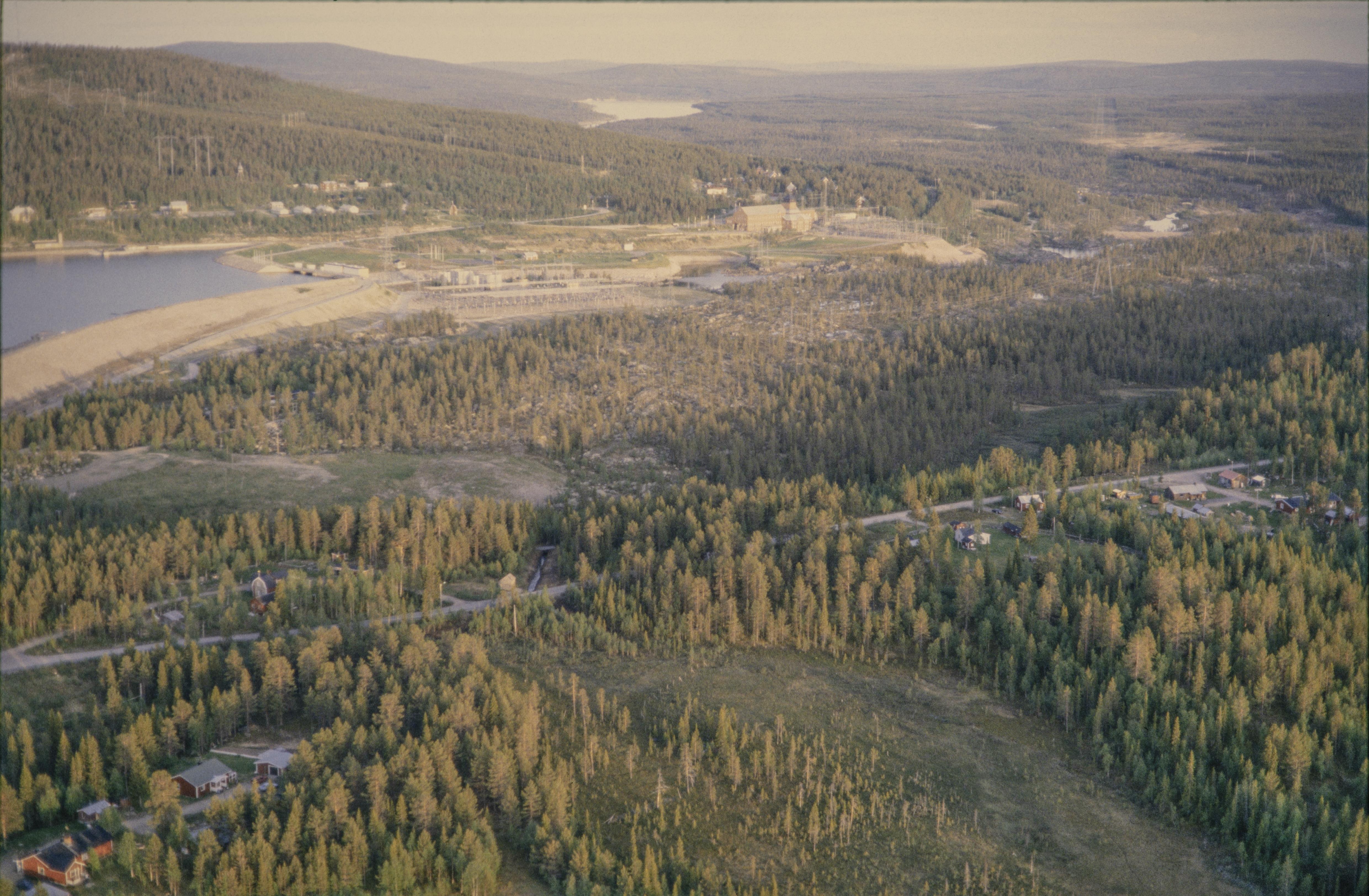 Beskrivning: Porjus (Bårjås) tätort och kraftverkssamhälle vid sjön Stora Lulevatten (Stuor Julevu) och Stora Luleälven (Stuor Julevädno). I bildens övre del Porjus kraftverk (nya och gamla) och minnesmärke RAÄnr Jokkmokk 1750:1. Porjus gamla kraftverk är byggnadsminne och industriminne. Bilden är tagen mot (väderstreck): S